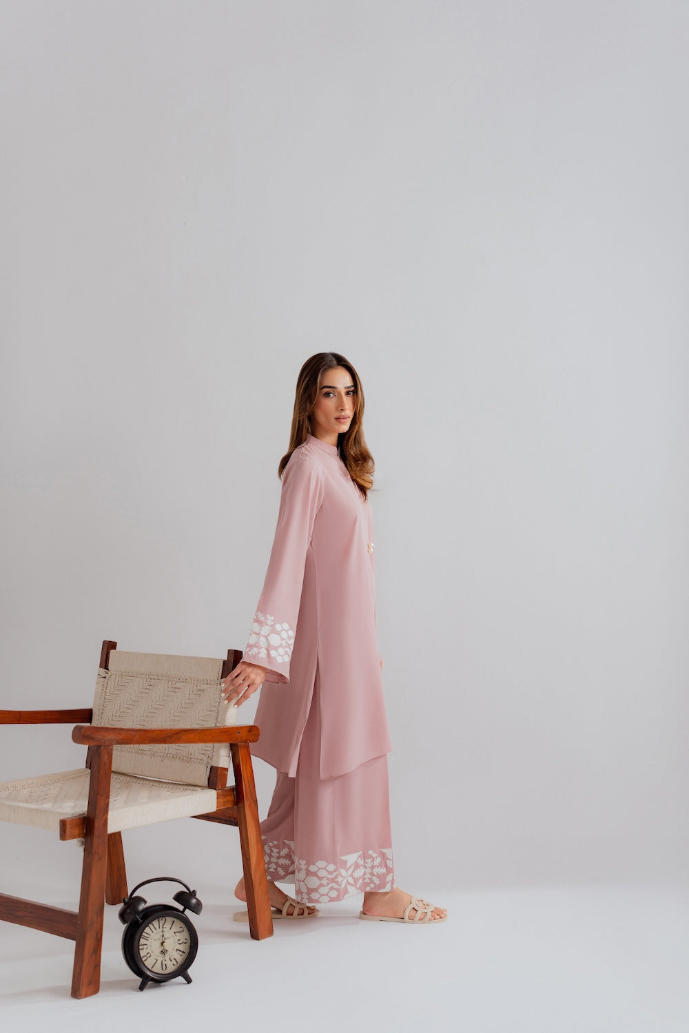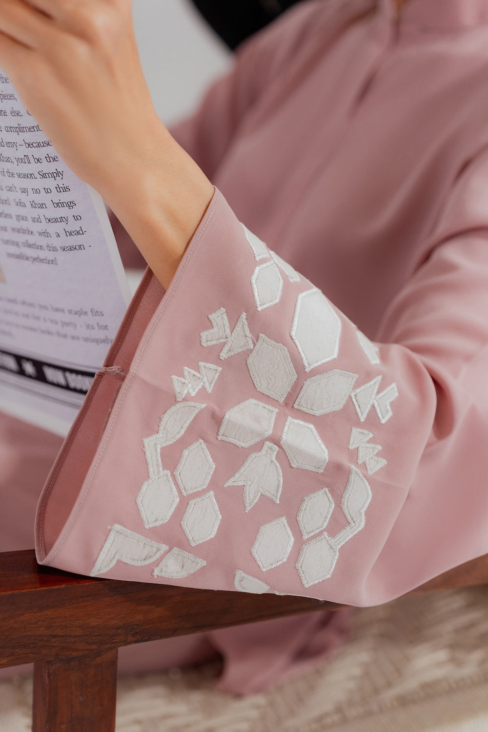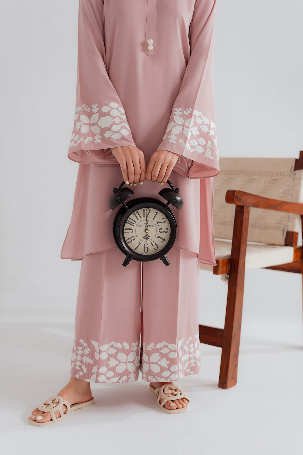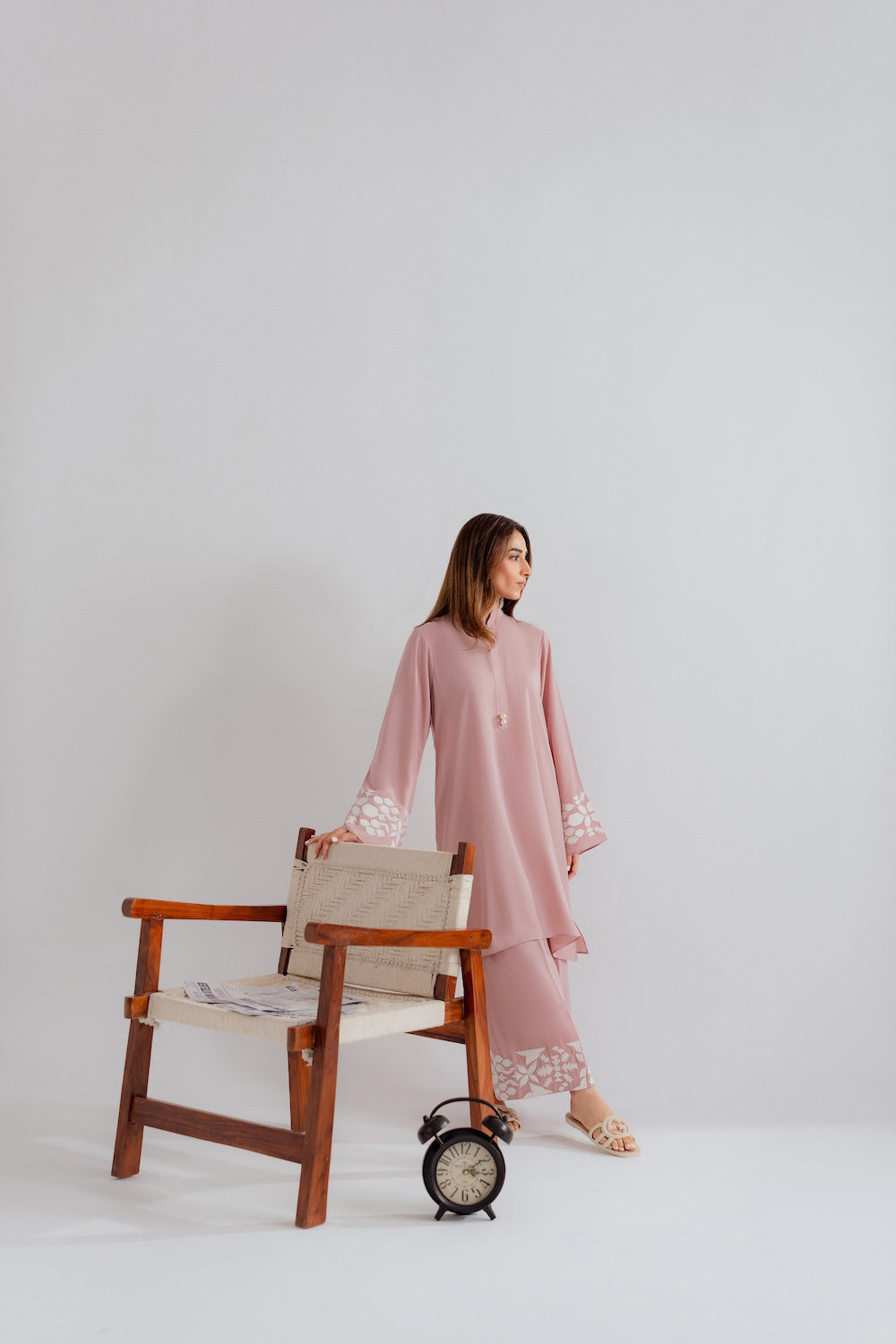 Soft, feminine, and effortlessly modern — this 2-piece blush pink outfit is all about elevated elegance. Featuring delicate applique embroidery on the sleeves and culottes, it adds a subtle yet striking texture to the overall look. The neckline is adorned with chunky pearl detailing, offering just the right touch of bold sophistication. With its contemporary silhouette and refined detailing, this ensemble is perfect for making a graceful statement at any occasion.