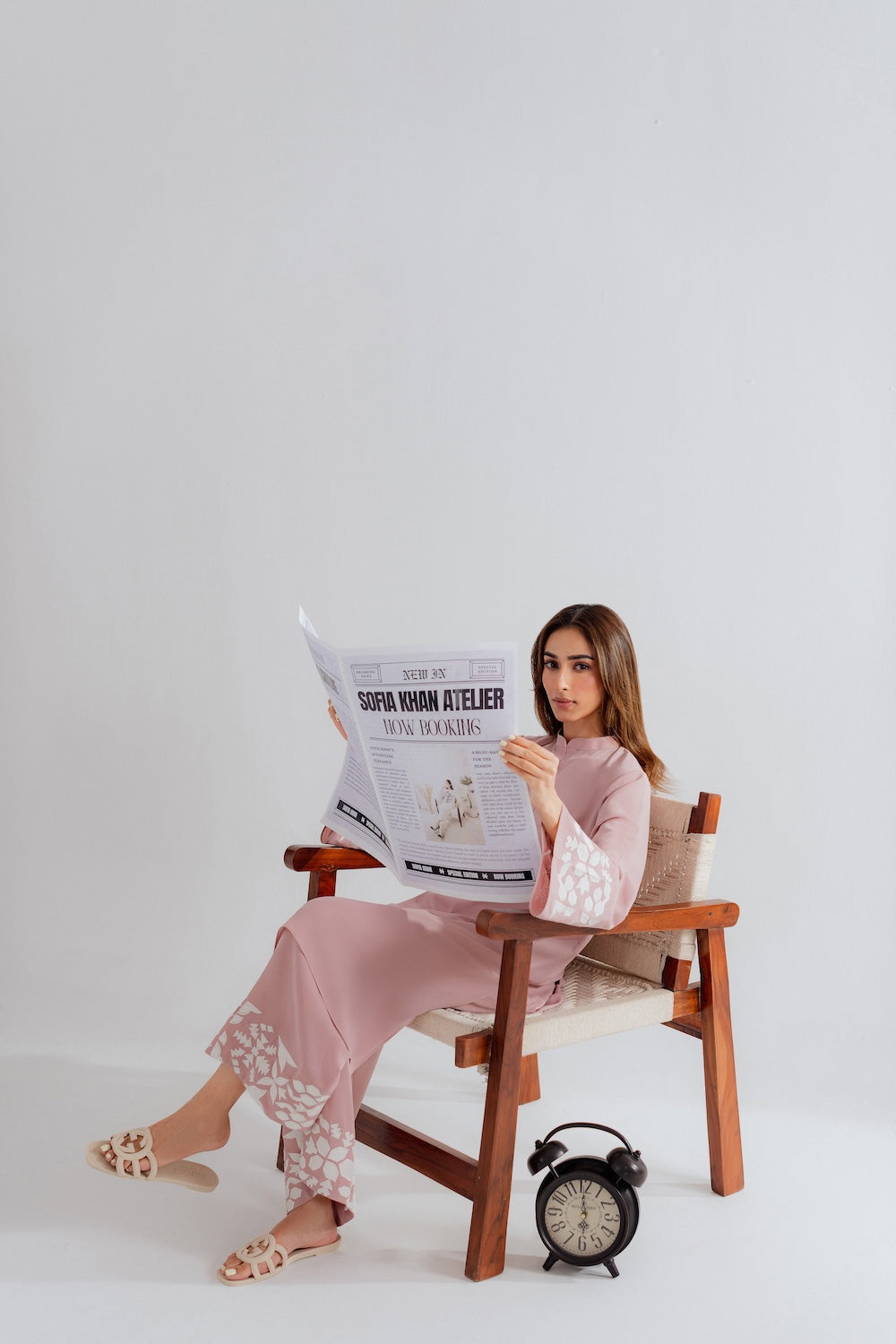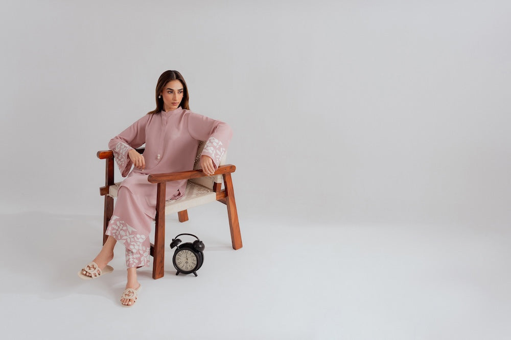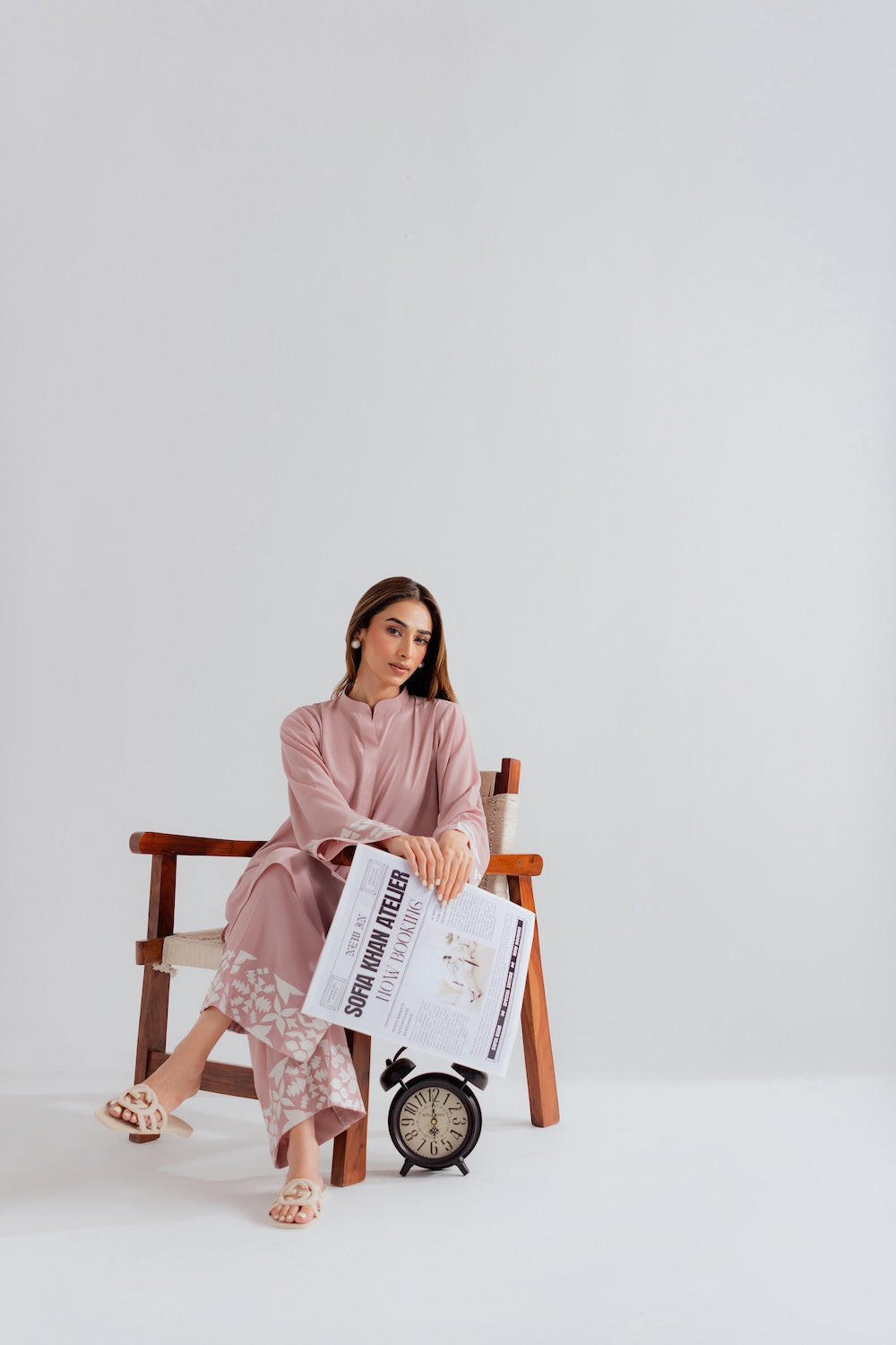 Soft, feminine, and effortlessly modern — this 2-piece blush pink outfit is all about elevated elegance. Featuring delicate applique embroidery on the sleeves and culottes, it adds a subtle yet striking texture to the overall look. The neckline is adorned with chunky pearl detailing, offering just the right touch of bold sophistication. With its contemporary silhouette and refined detailing, this ensemble is perfect for making a graceful statement at any occasion.