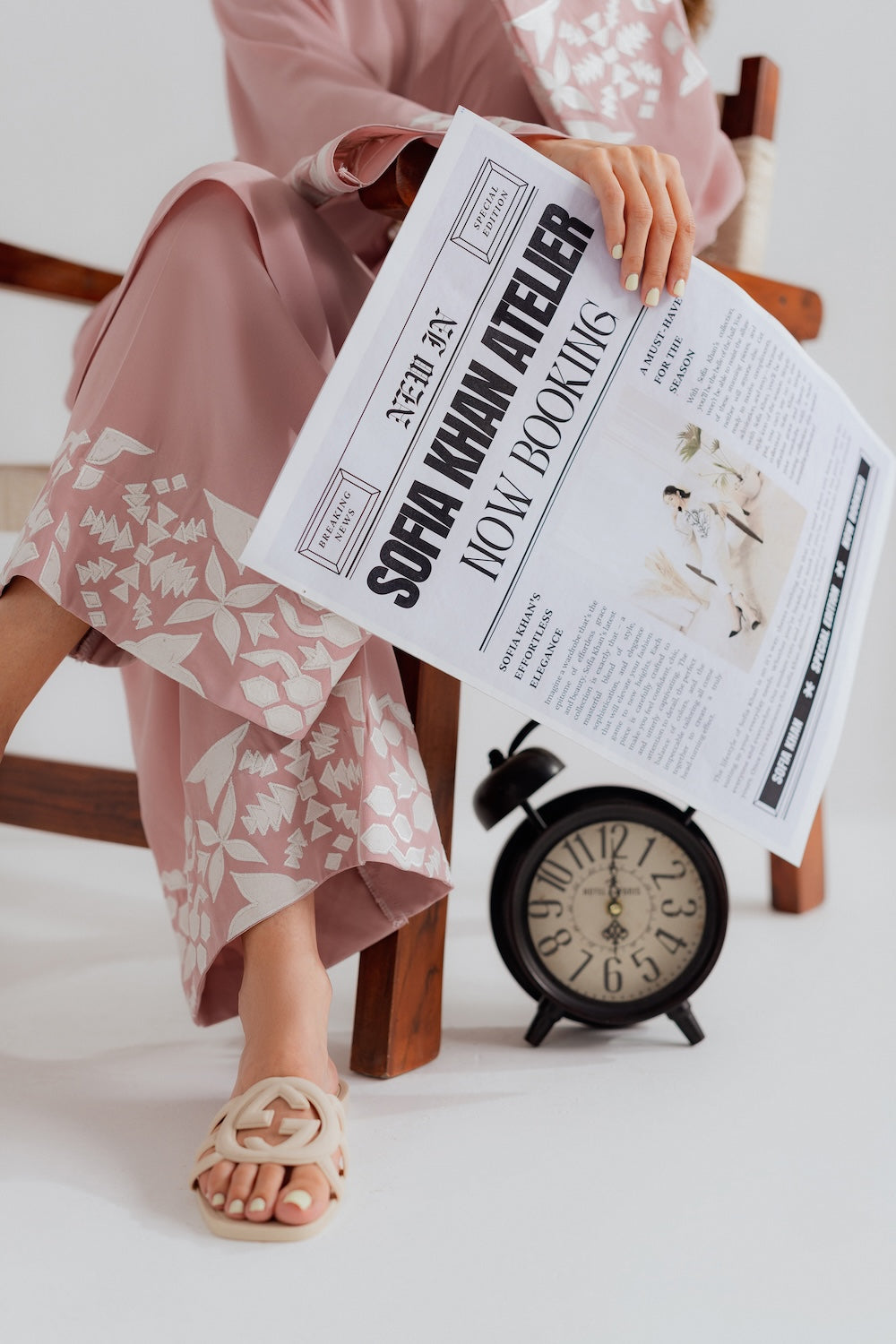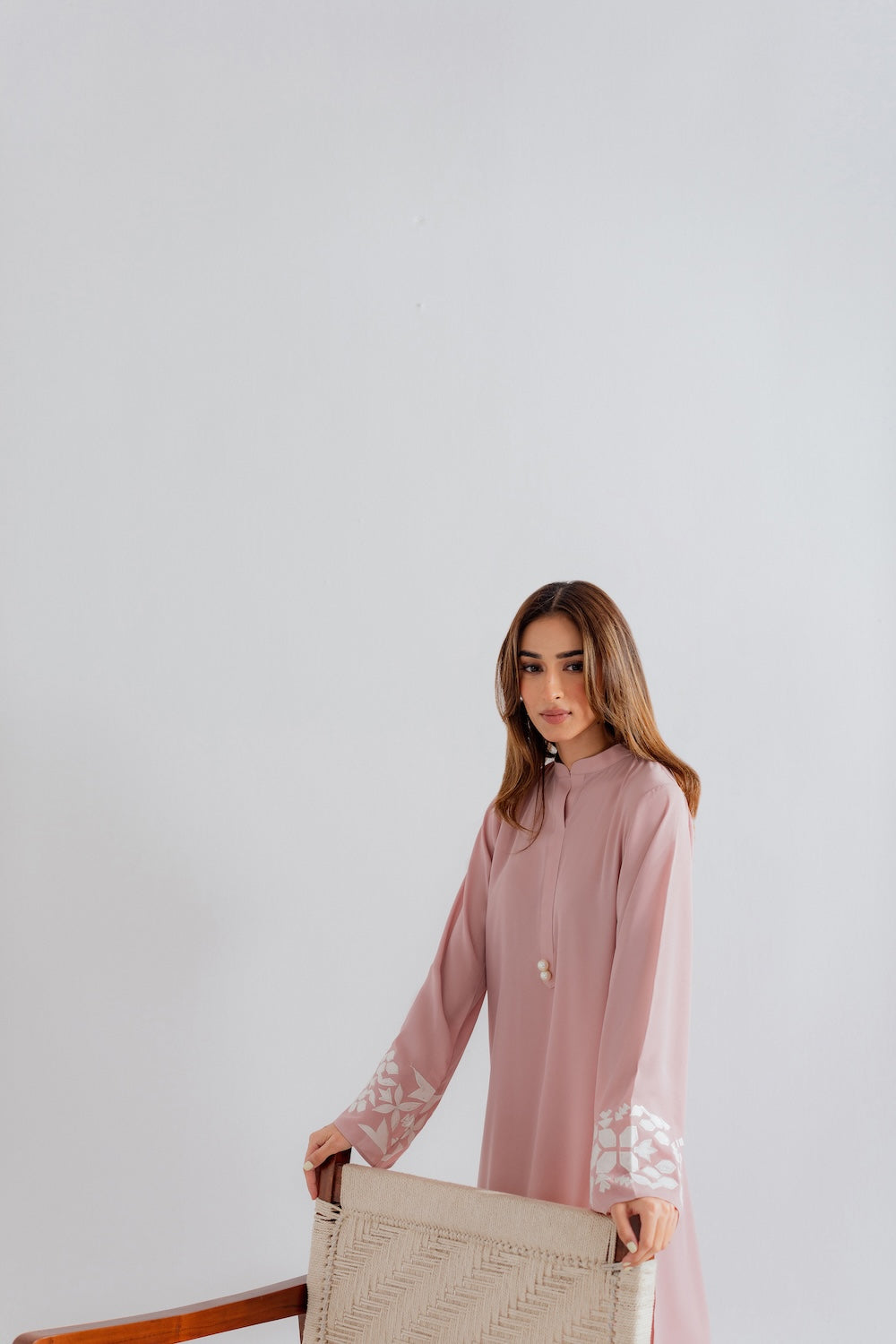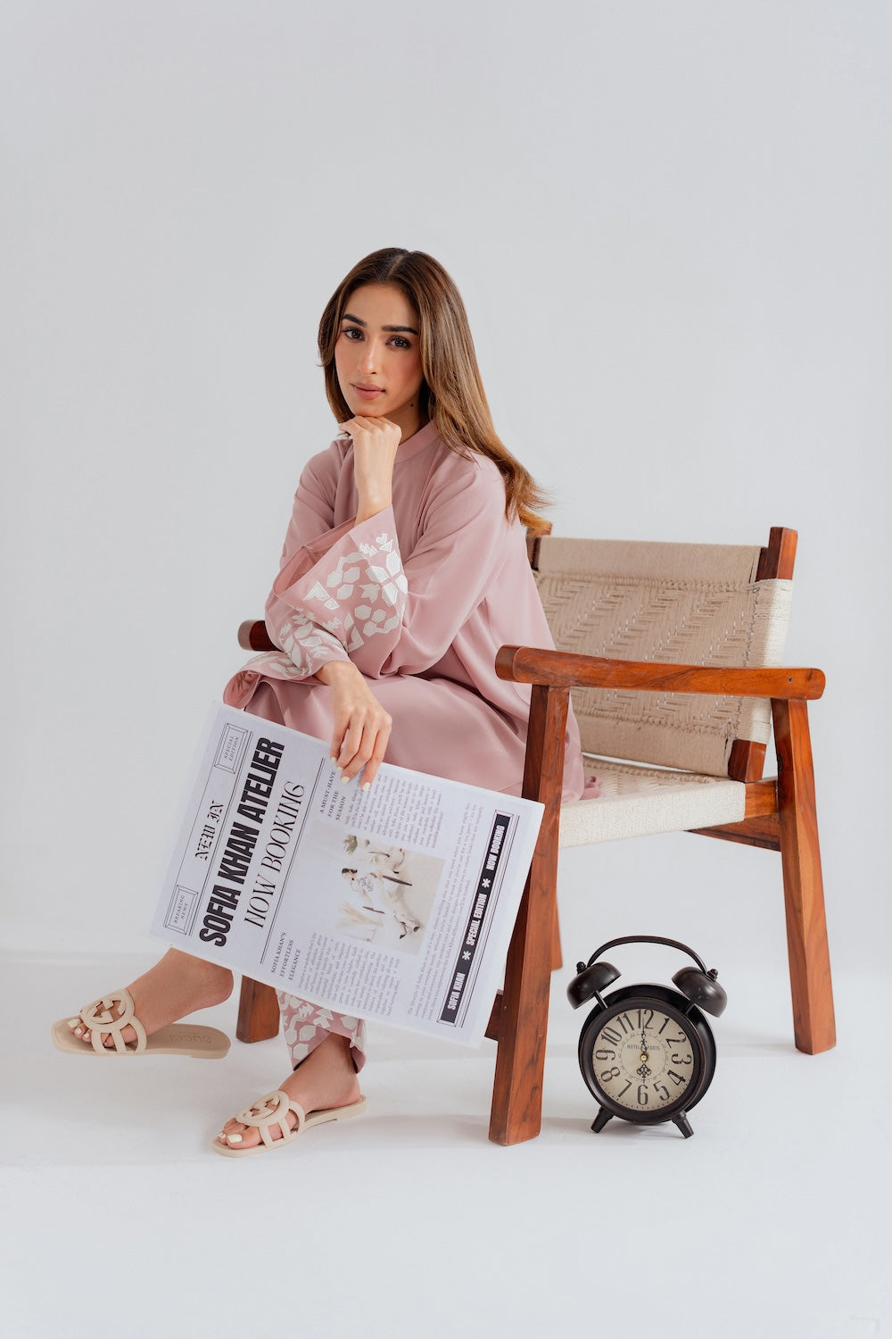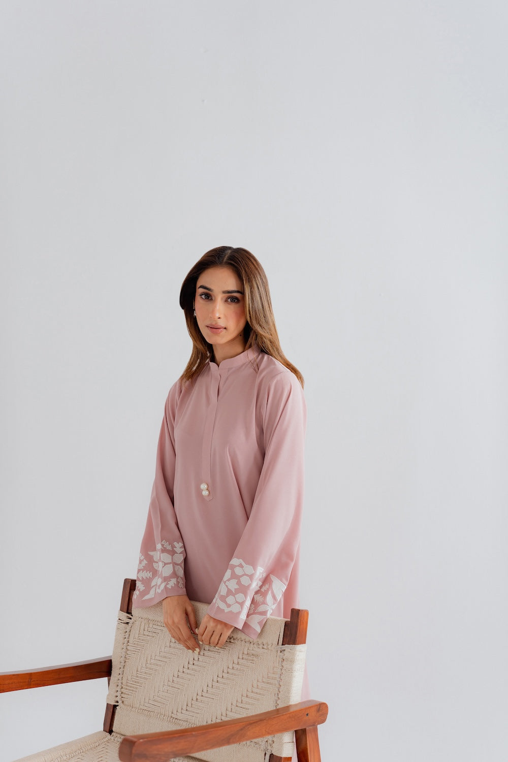 Soft, feminine, and effortlessly modern — this 2-piece blush pink outfit is all about elevated elegance. Featuring delicate applique embroidery on the sleeves and culottes, it adds a subtle yet striking texture to the overall look. The neckline is adorned with chunky pearl detailing, offering just the right touch of bold sophistication. With its contemporary silhouette and refined detailing, this ensemble is perfect for making a graceful statement at any occasion.