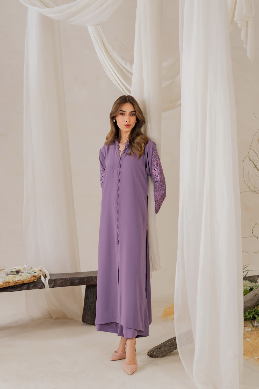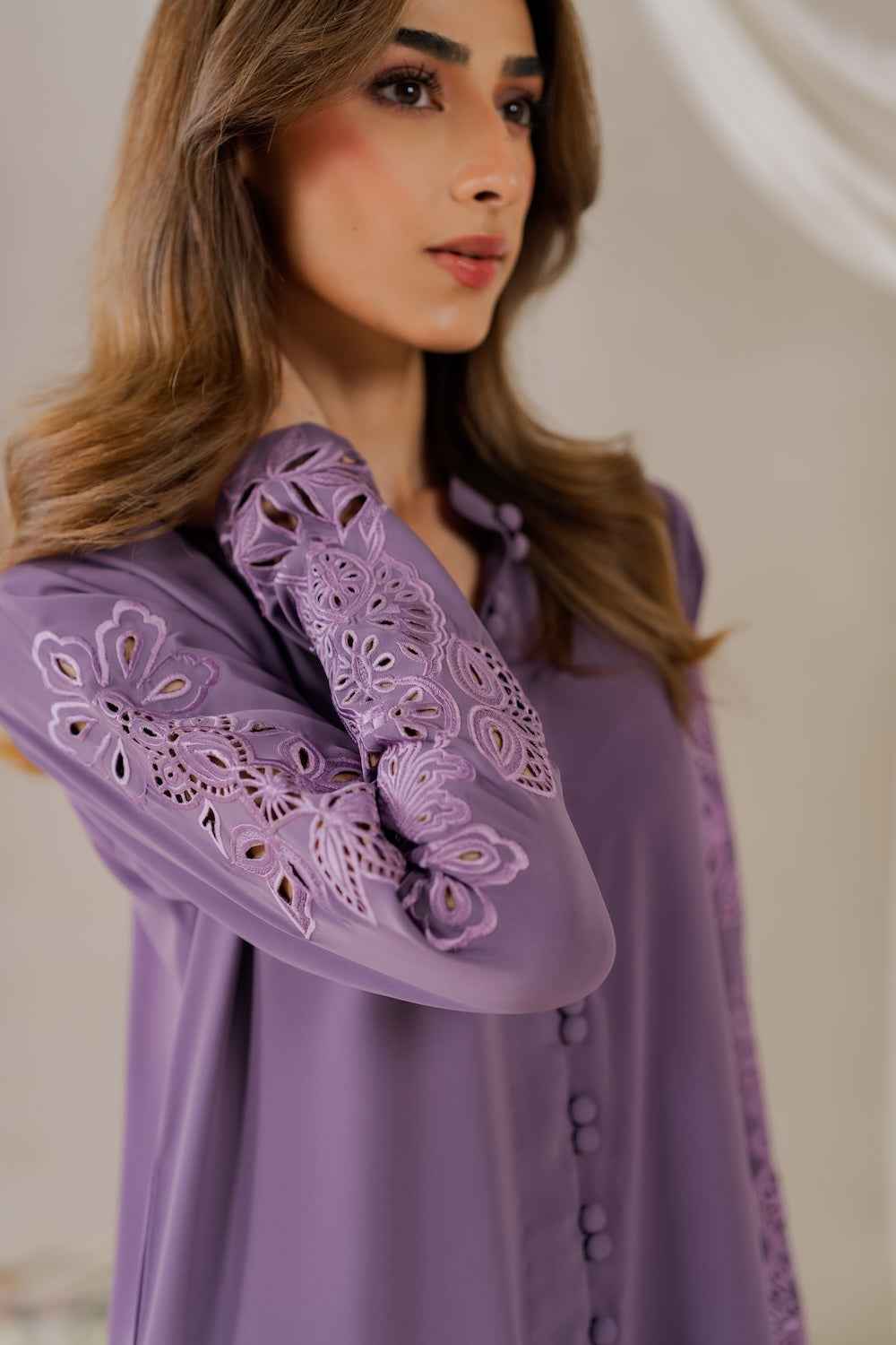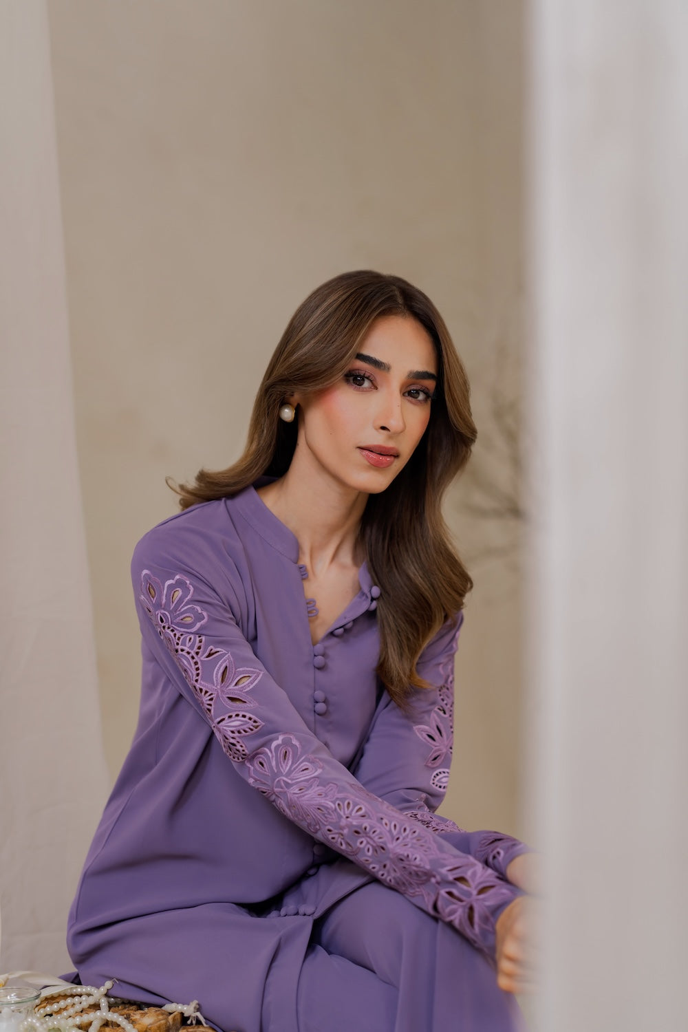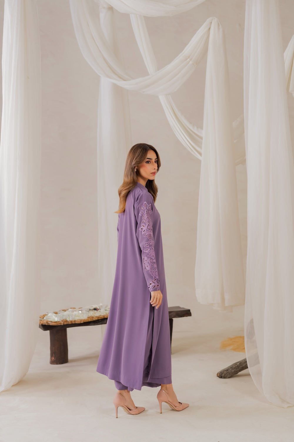 Make a statement at your next evening soiree with this stunning lilac outfit, featuring gorgeous cutwork embroidery on the sleeves. With its creaseless fabric, you can enjoy effortless elegance all night long, turning heads with every move.