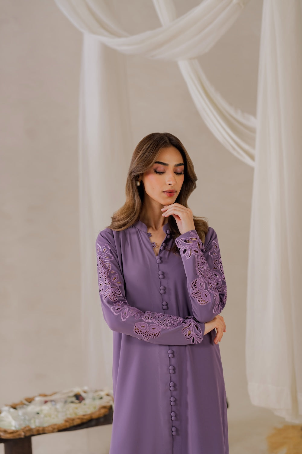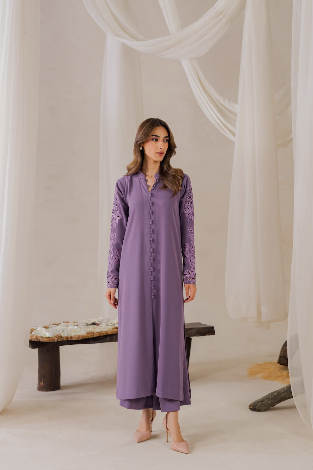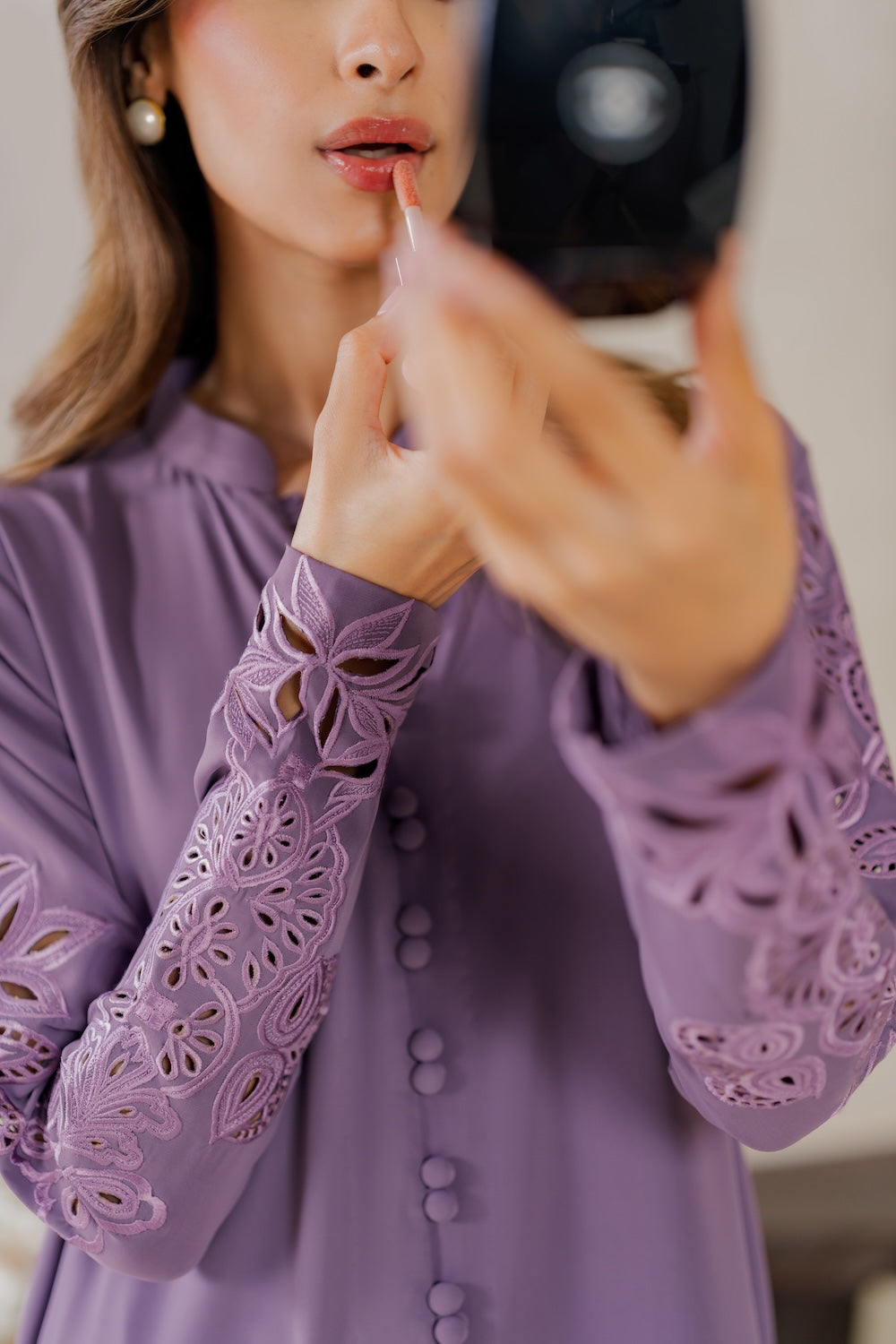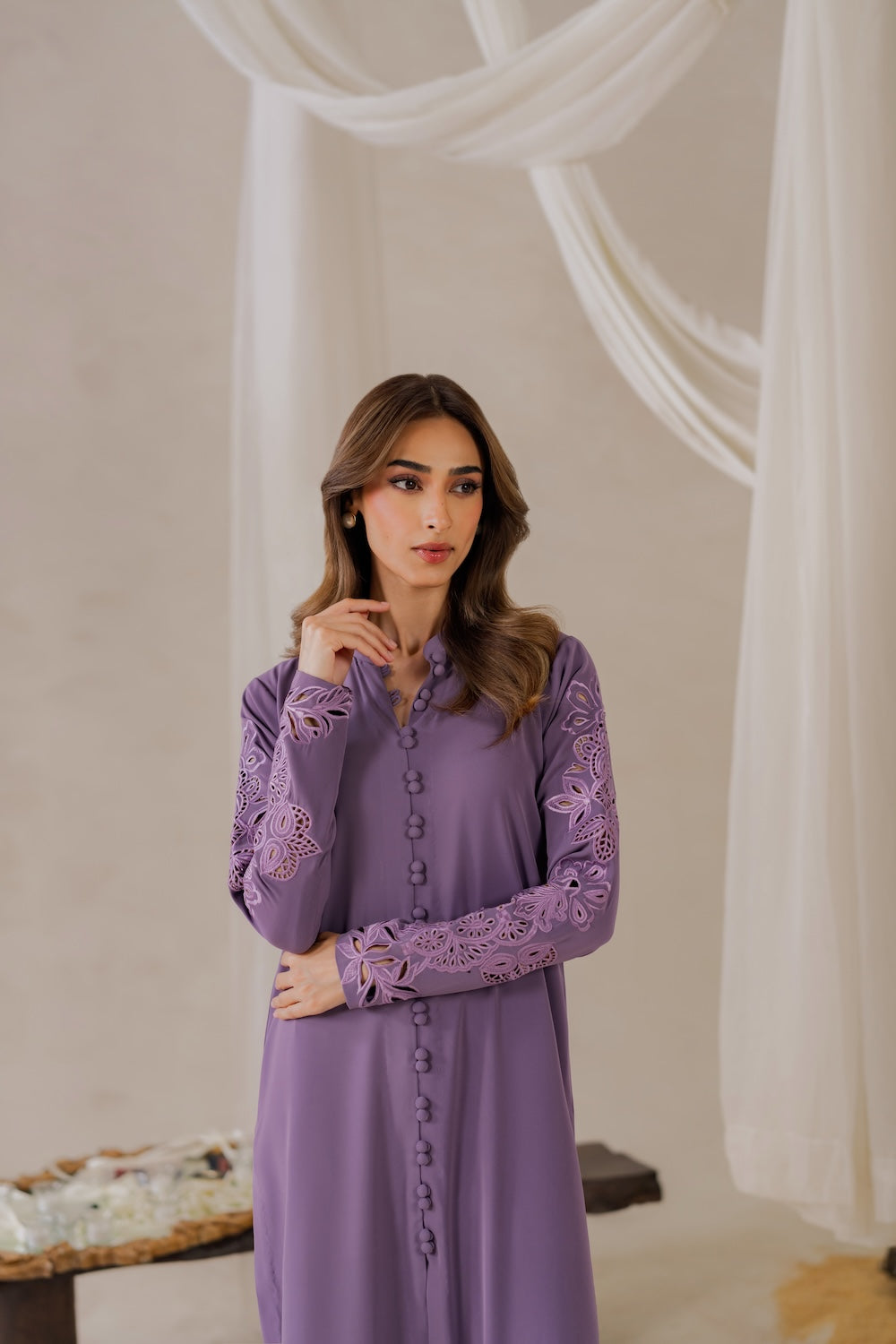 Make a statement at your next evening soiree with this stunning lilac outfit, featuring gorgeous cutwork embroidery on the sleeves. With its creaseless fabric, you can enjoy effortless elegance all night long, turning heads with every move.