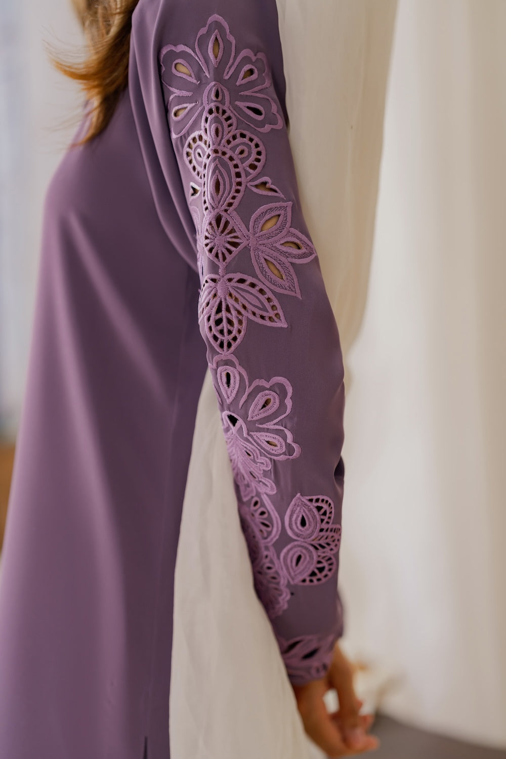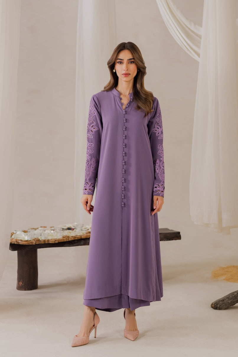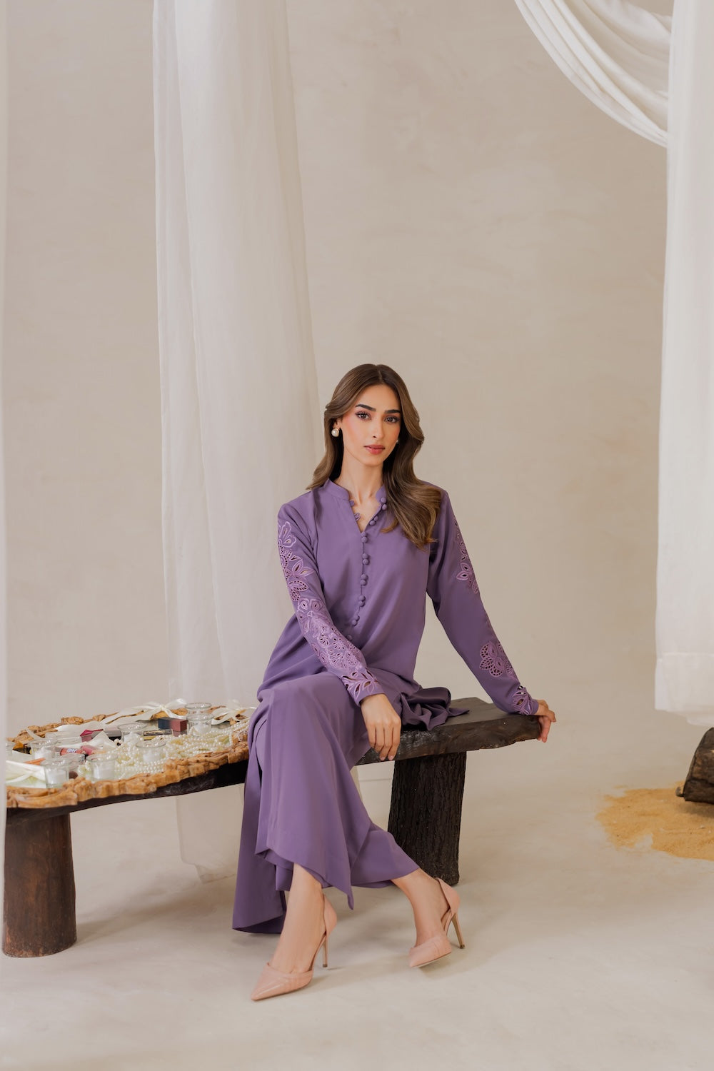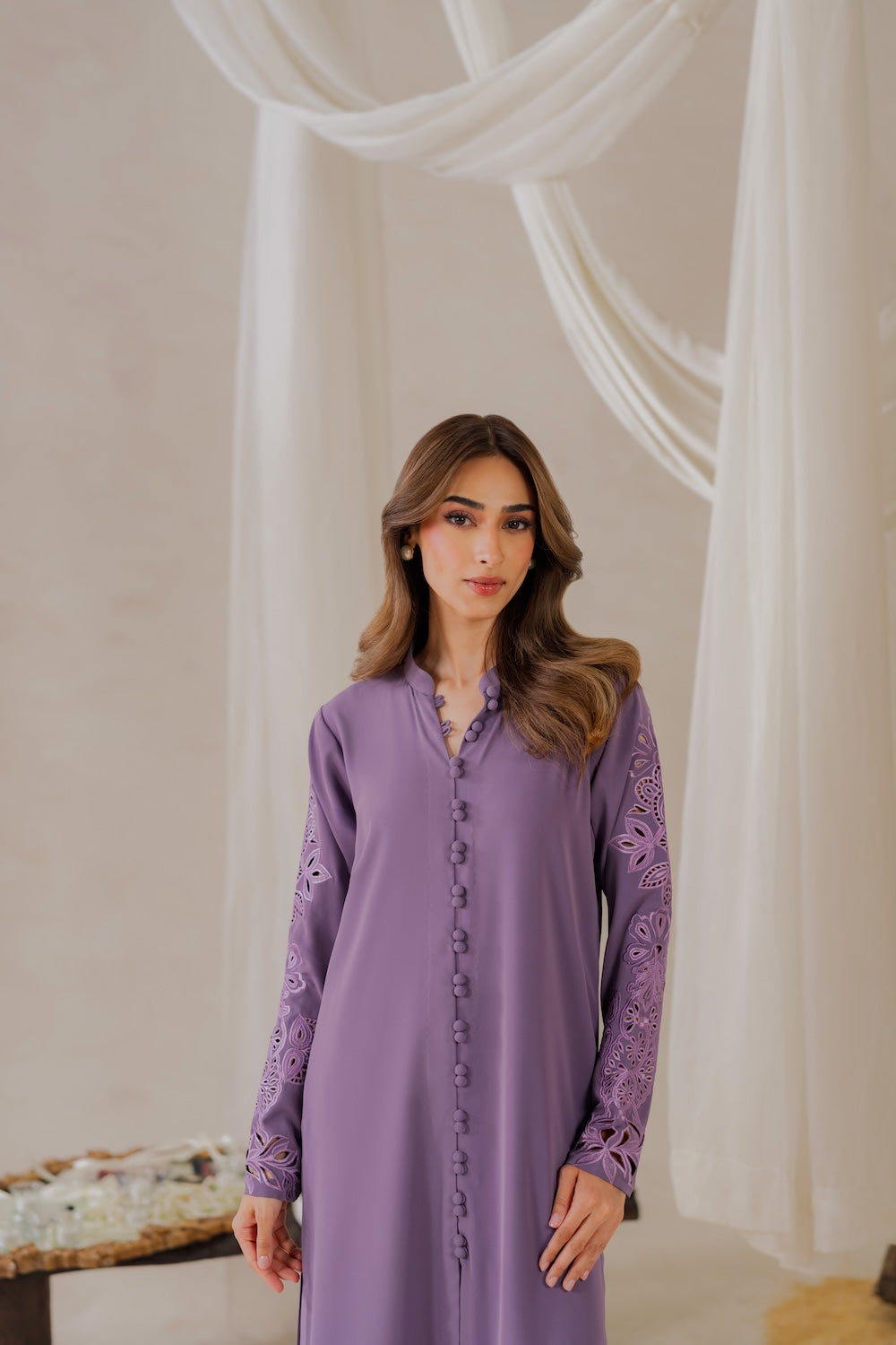 Make a statement at your next evening soiree with this stunning lilac outfit, featuring gorgeous cutwork embroidery on the sleeves. With its creaseless fabric, you can enjoy effortless elegance all night long, turning heads with every move.