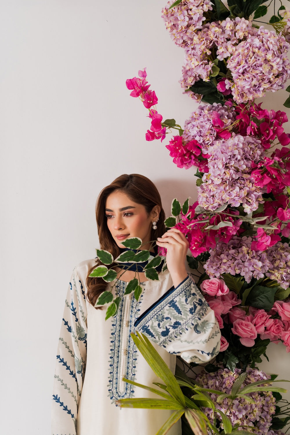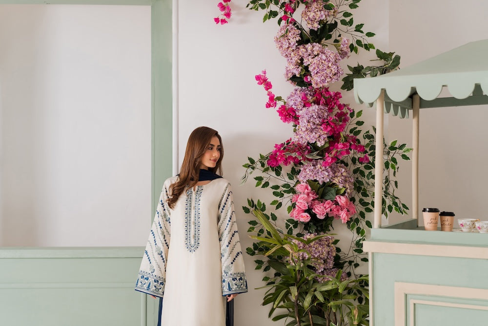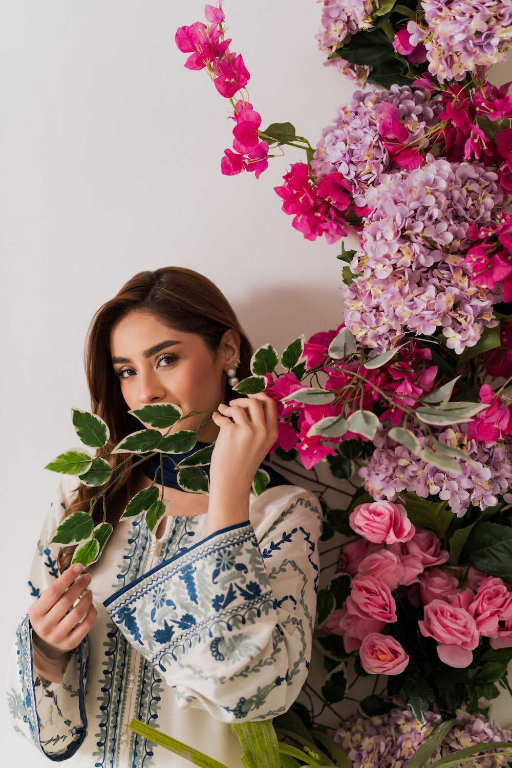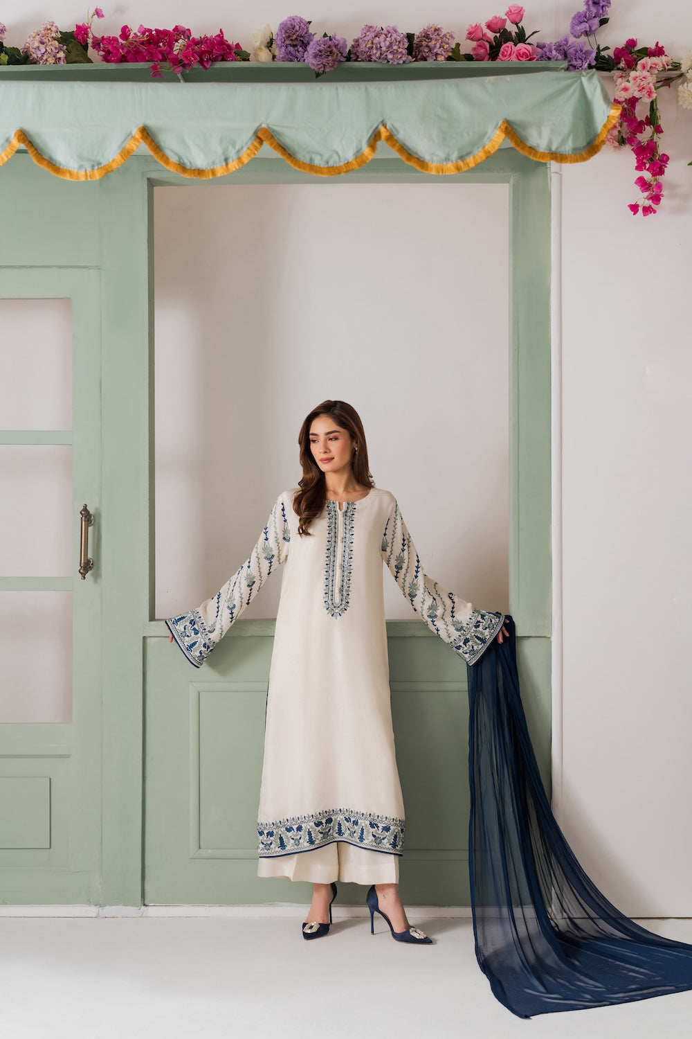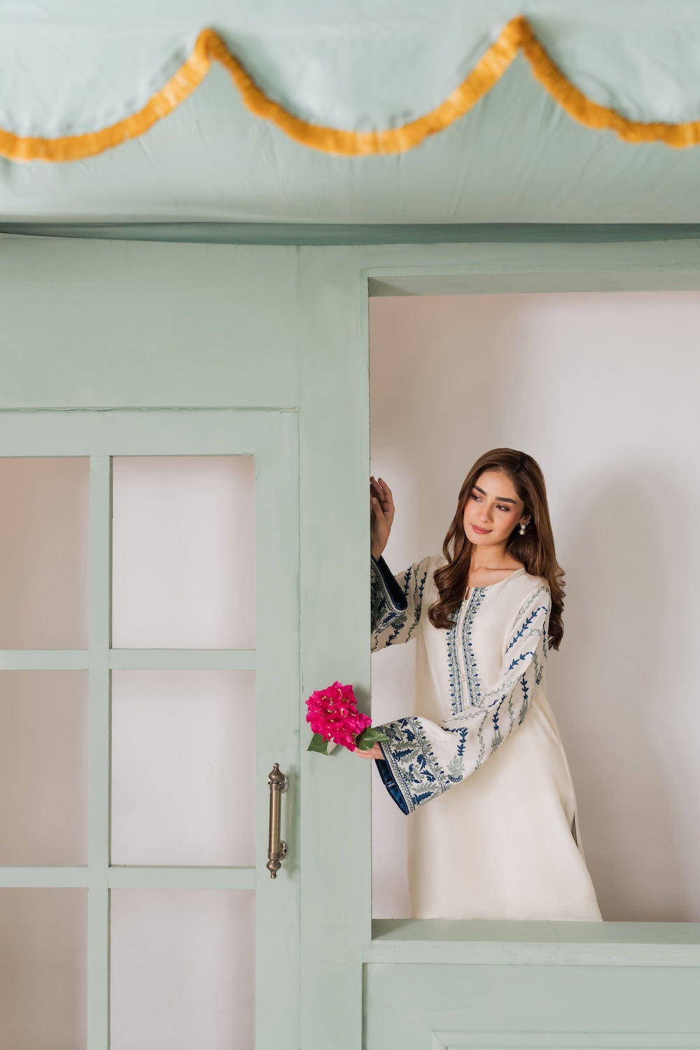 Embrace festive elegance this Eid with our off-white 2-piece outfit, featuring a hand-aari embroidered shirt adorned with delicate design. The intricate detailing adds a subtle sparkle, beautifully complementing the soft, feminine hue. Perfectly balanced between tradition and contemporary style, this outfit is ideal for Eid celebrations and daytime festivities.