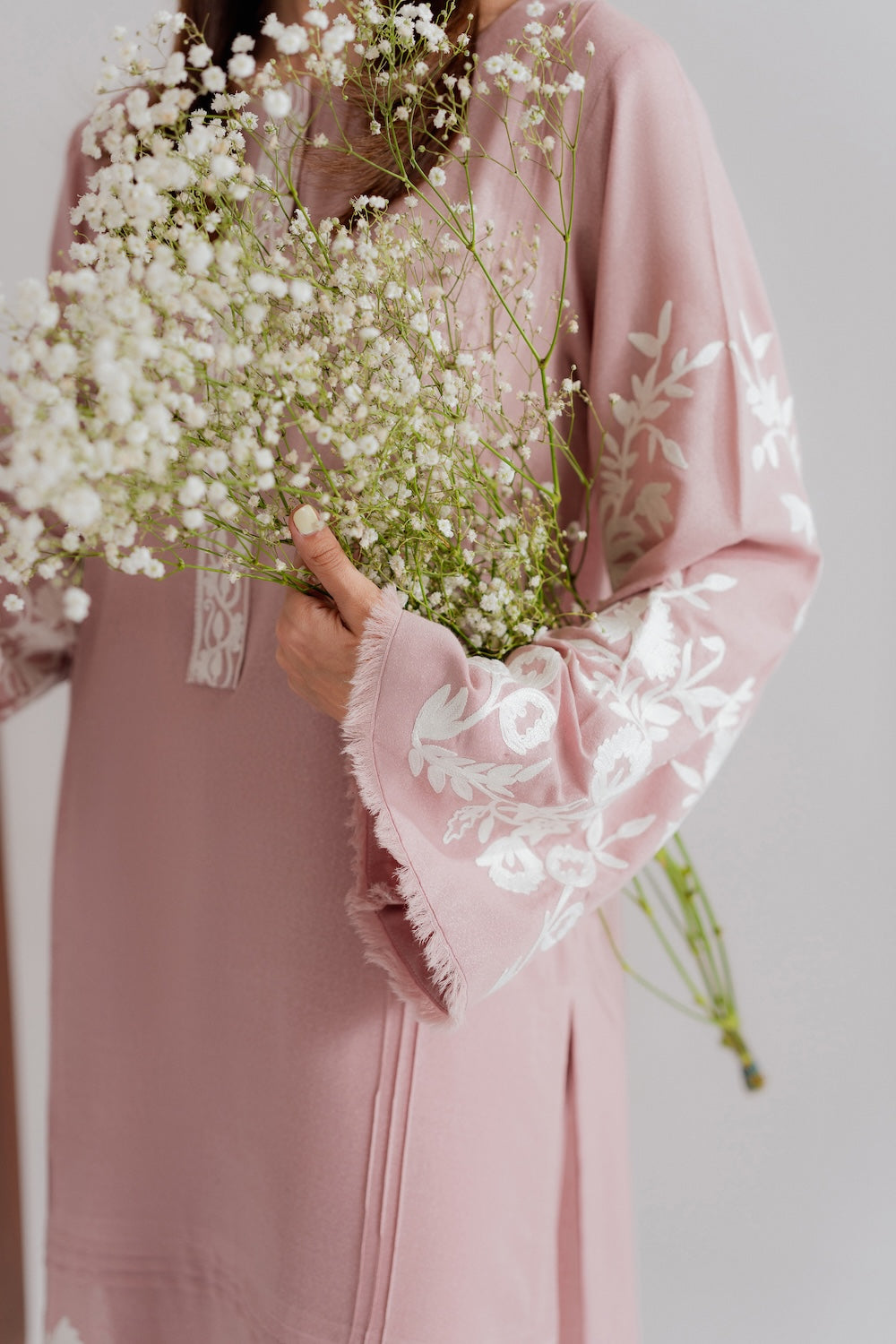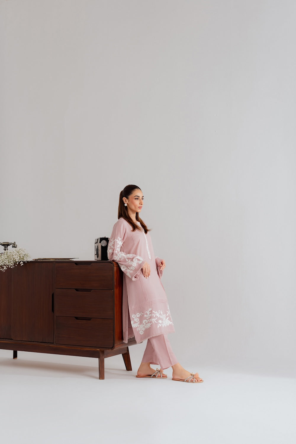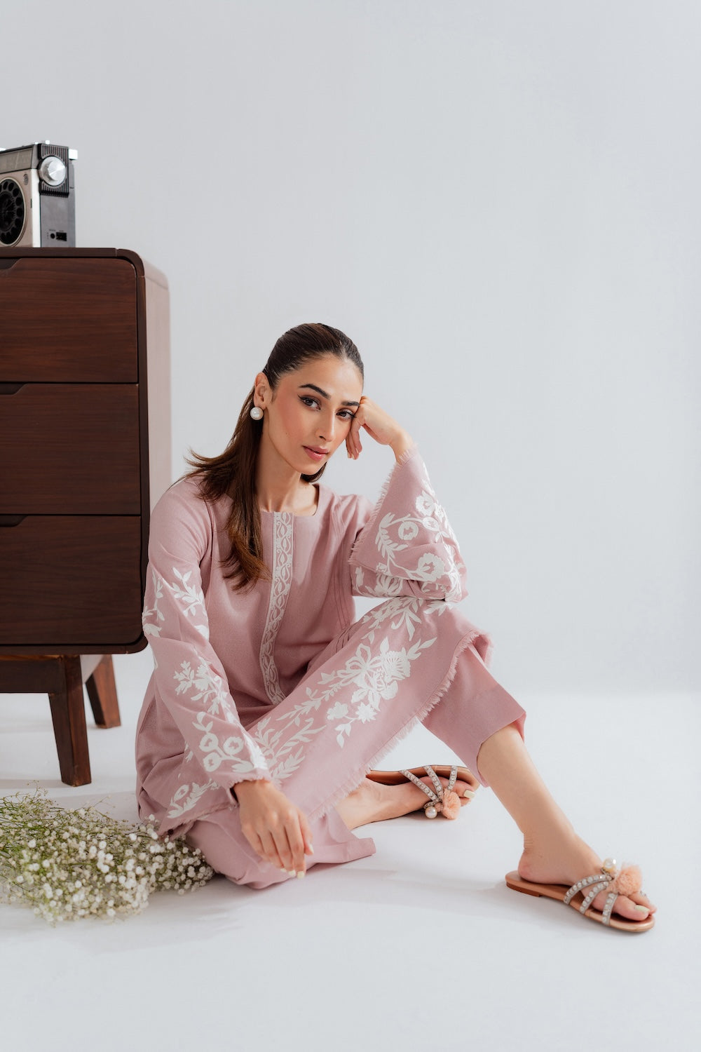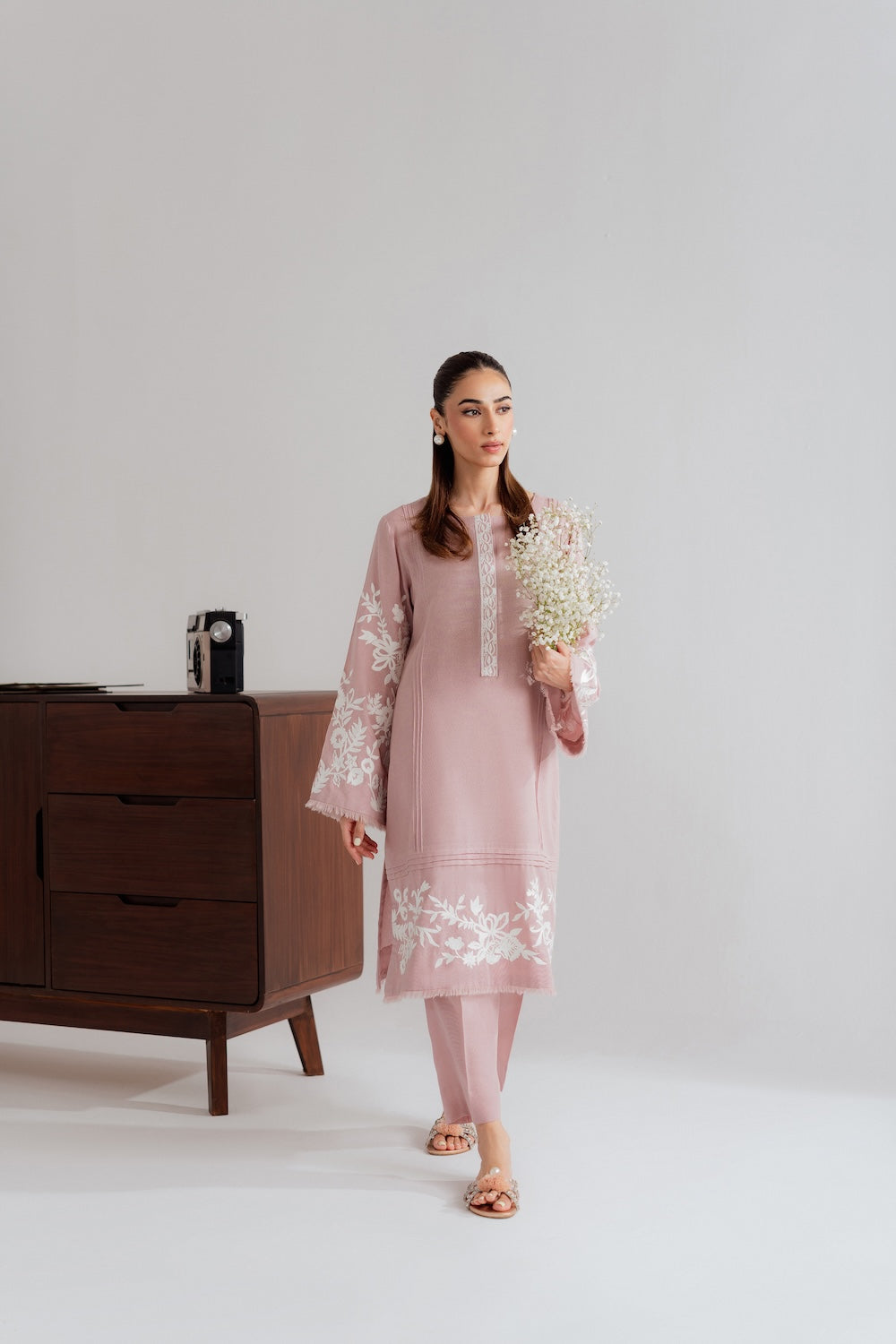 Delicate with a modern twist, this 2-piece powder pink outfit is the epitome of effortless elegance. Adorned with intricate embroidery on the sleeves, daaman, and neckline, it’s elevated further with criss-cross pleated detailing at the front, adding a unique, structured charm. Thread fringes on the daaman and sleeves bring playful movement and texture, perfectly tying together tradition and trend. This ensemble is ideal for those who love soft, feminine hues with standout contemporary details.