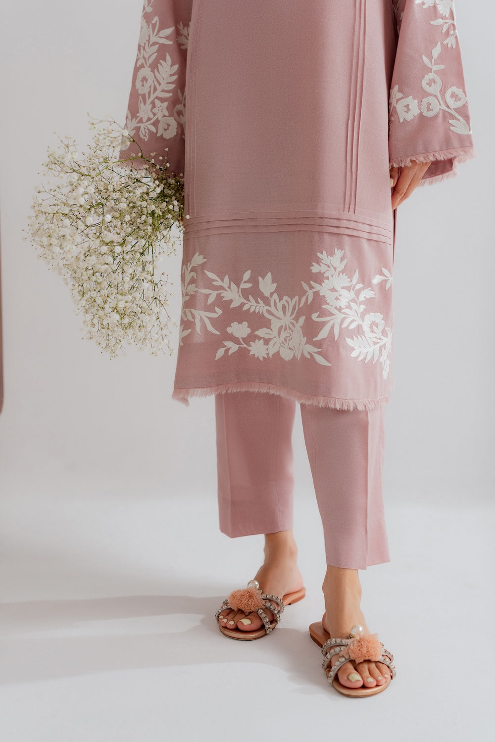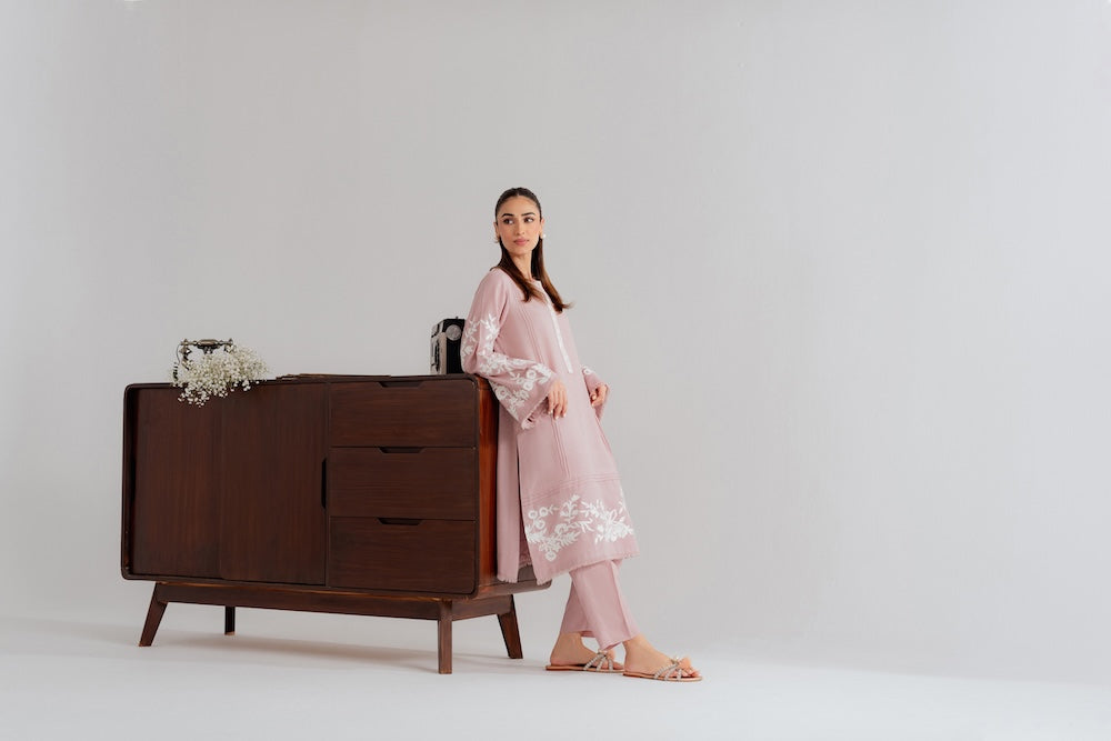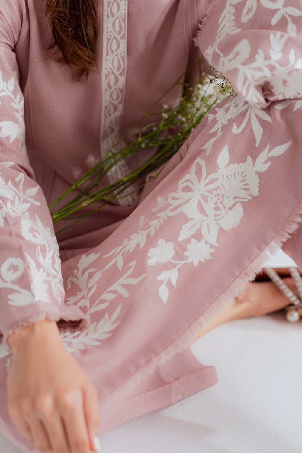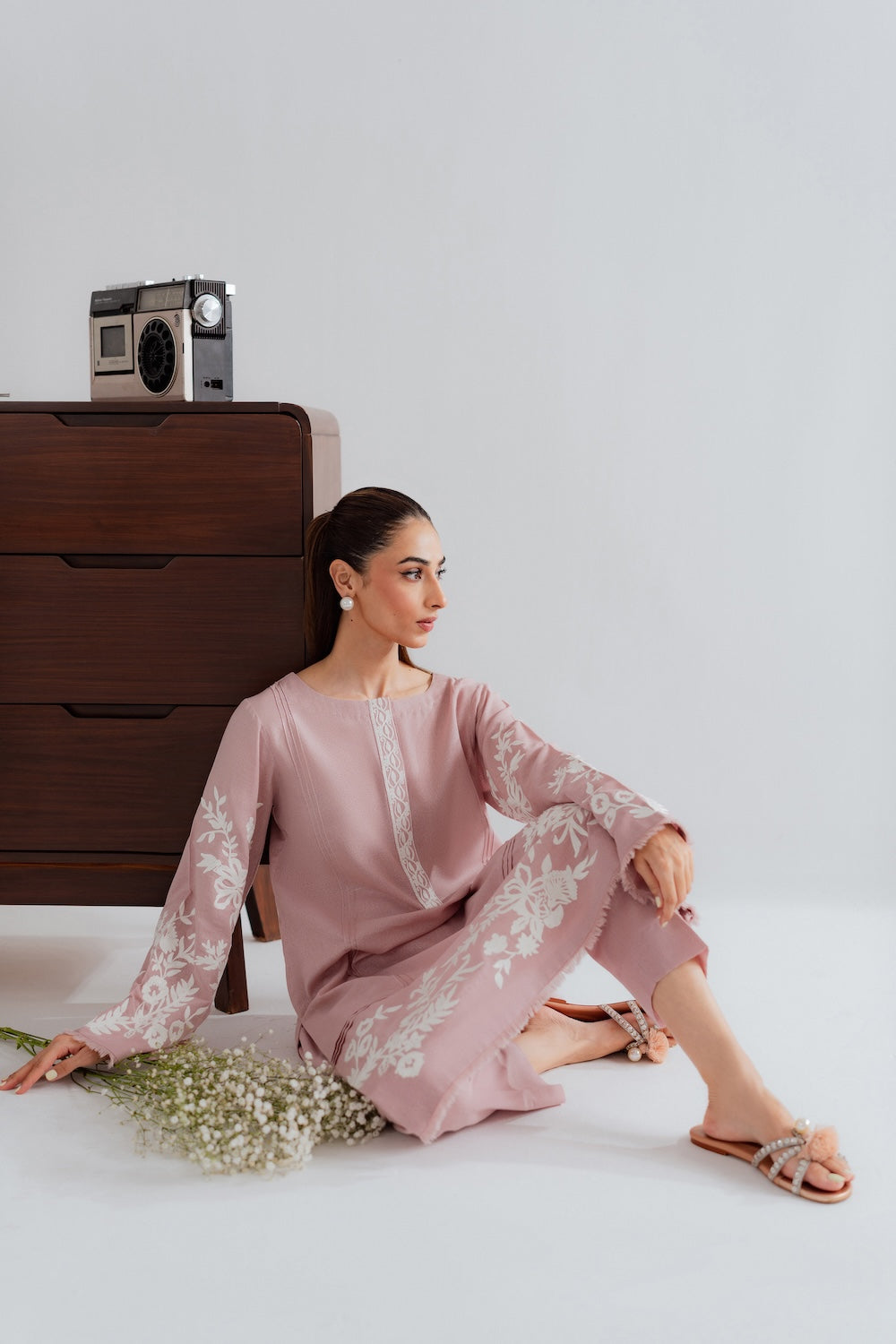 Delicate with a modern twist, this 2-piece powder pink outfit is the epitome of effortless elegance. Adorned with intricate embroidery on the sleeves, daaman, and neckline, it’s elevated further with criss-cross pleated detailing at the front, adding a unique, structured charm. Thread fringes on the daaman and sleeves bring playful movement and texture, perfectly tying together tradition and trend. This ensemble is ideal for those who love soft, feminine hues with standout contemporary details.