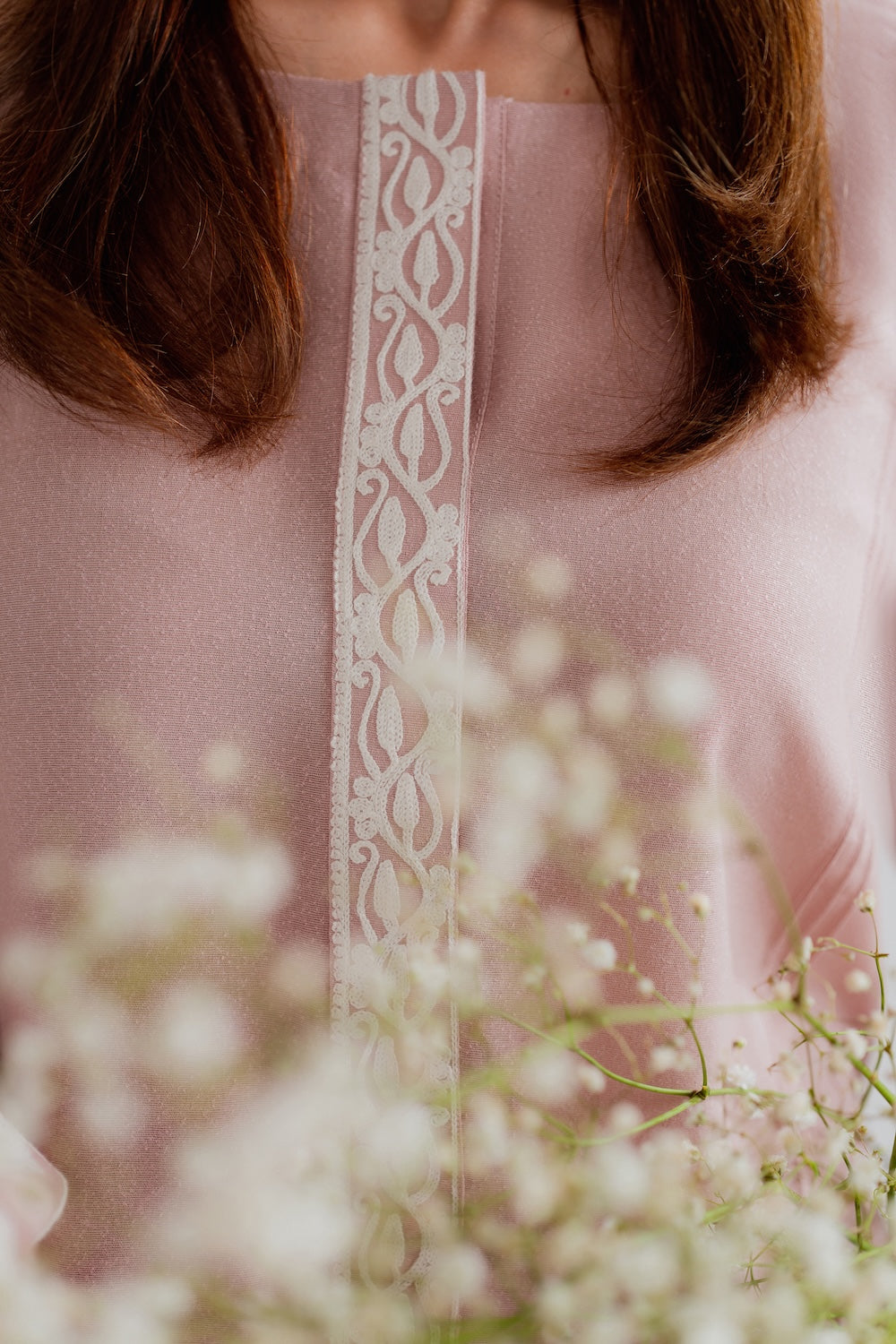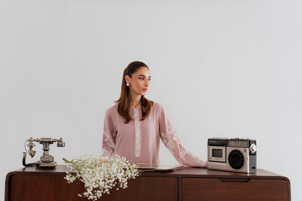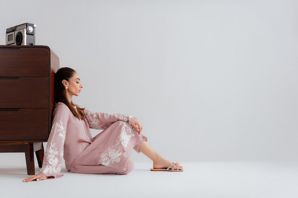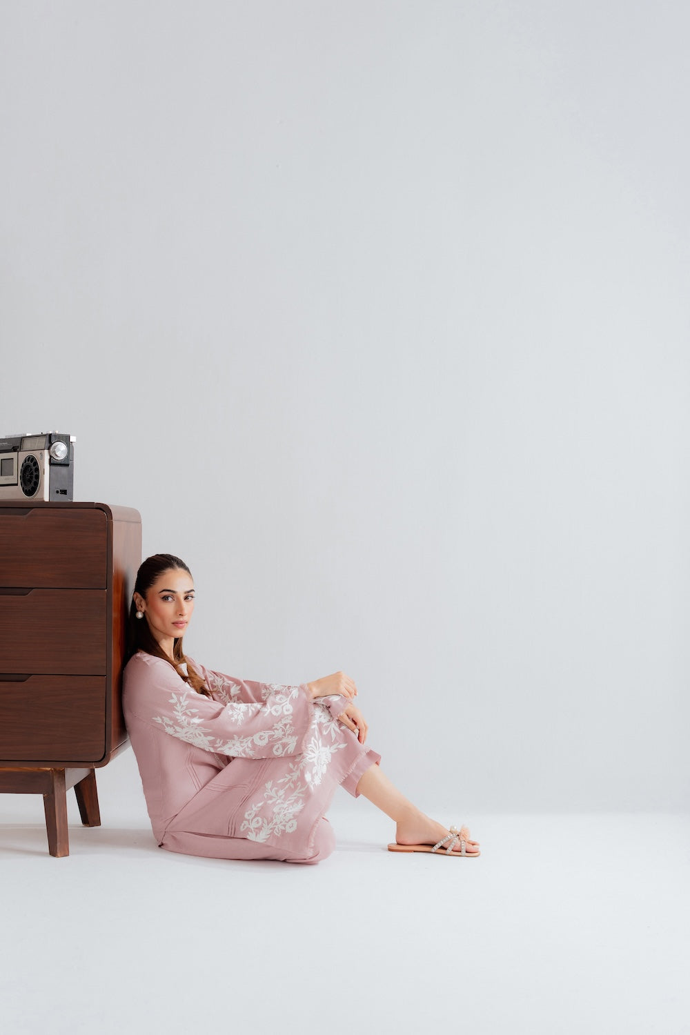 Delicate with a modern twist, this 2-piece powder pink outfit is the epitome of effortless elegance. Adorned with intricate embroidery on the sleeves, daaman, and neckline, it’s elevated further with criss-cross pleated detailing at the front, adding a unique, structured charm. Thread fringes on the daaman and sleeves bring playful movement and texture, perfectly tying together tradition and trend. This ensemble is ideal for those who love soft, feminine hues with standout contemporary details.