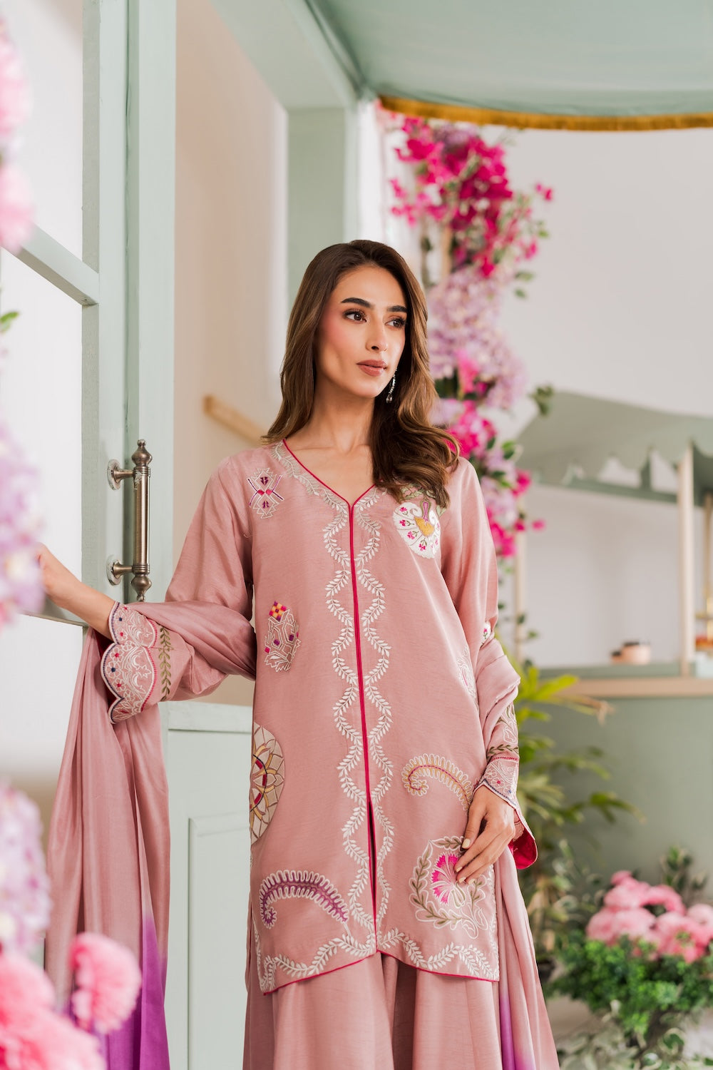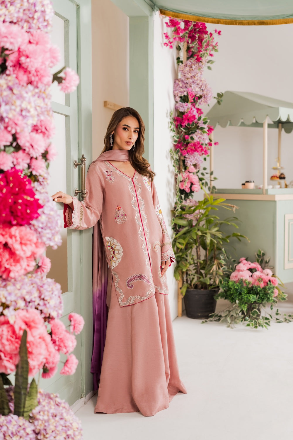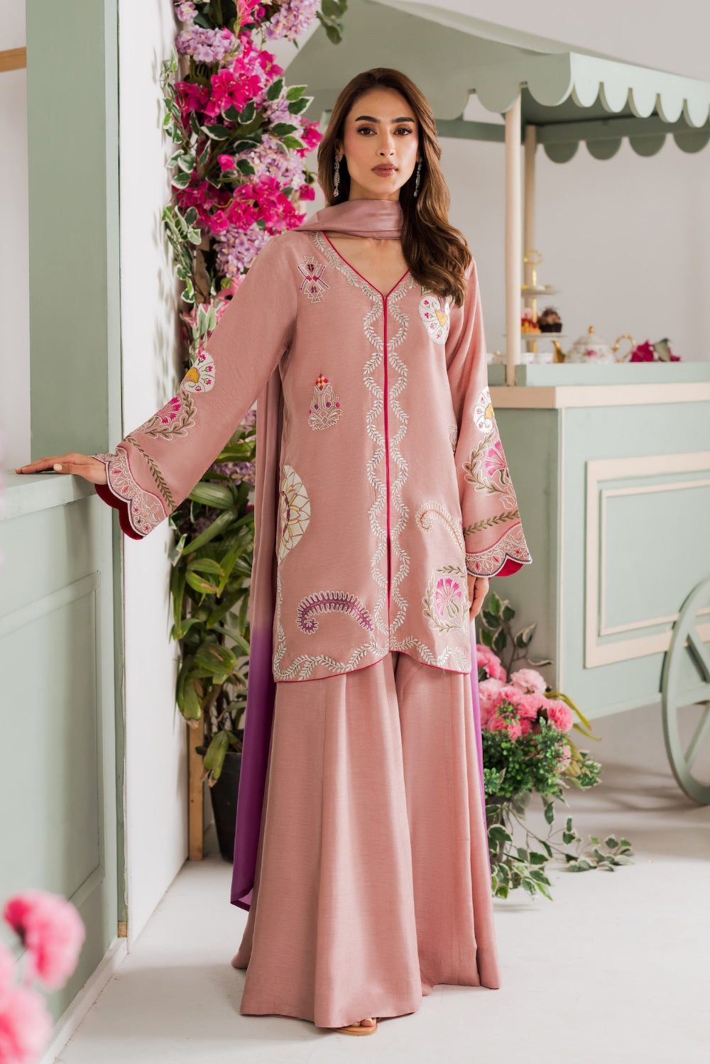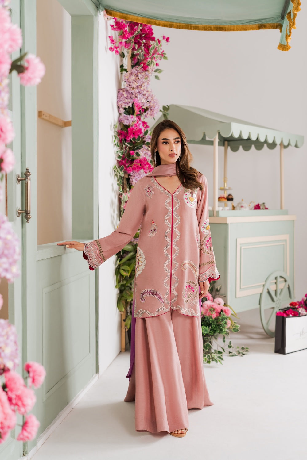 A refined beige colored two-piece outfit featuring delicate hand-aari embroidery on the shirt. Perfect for Eid, it reflects understated elegance and festive charm. The look can be elevated with a separately available silk embroidered dupatta for added grace.