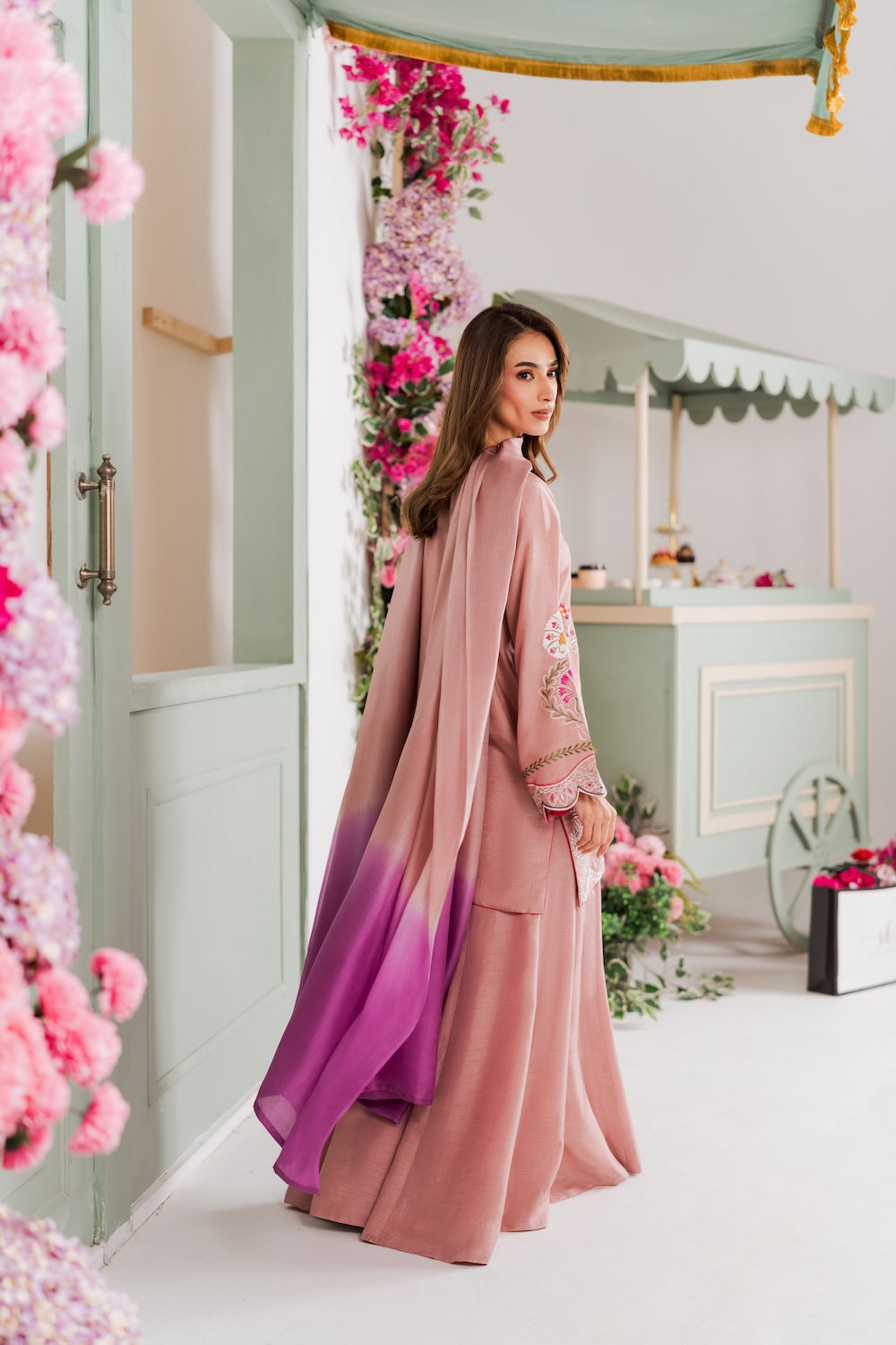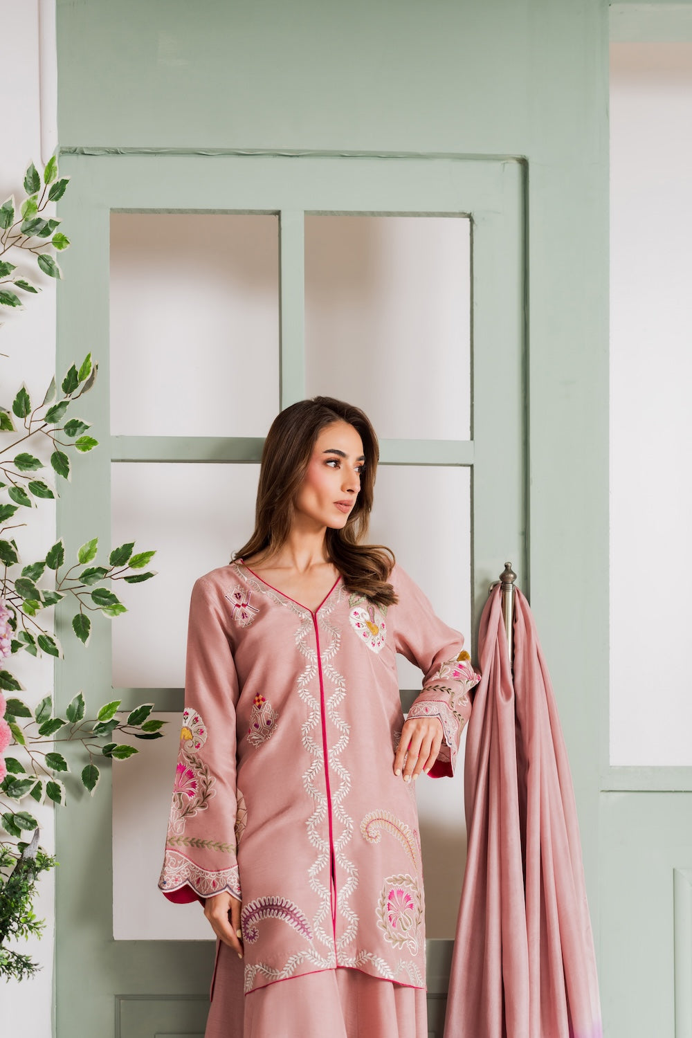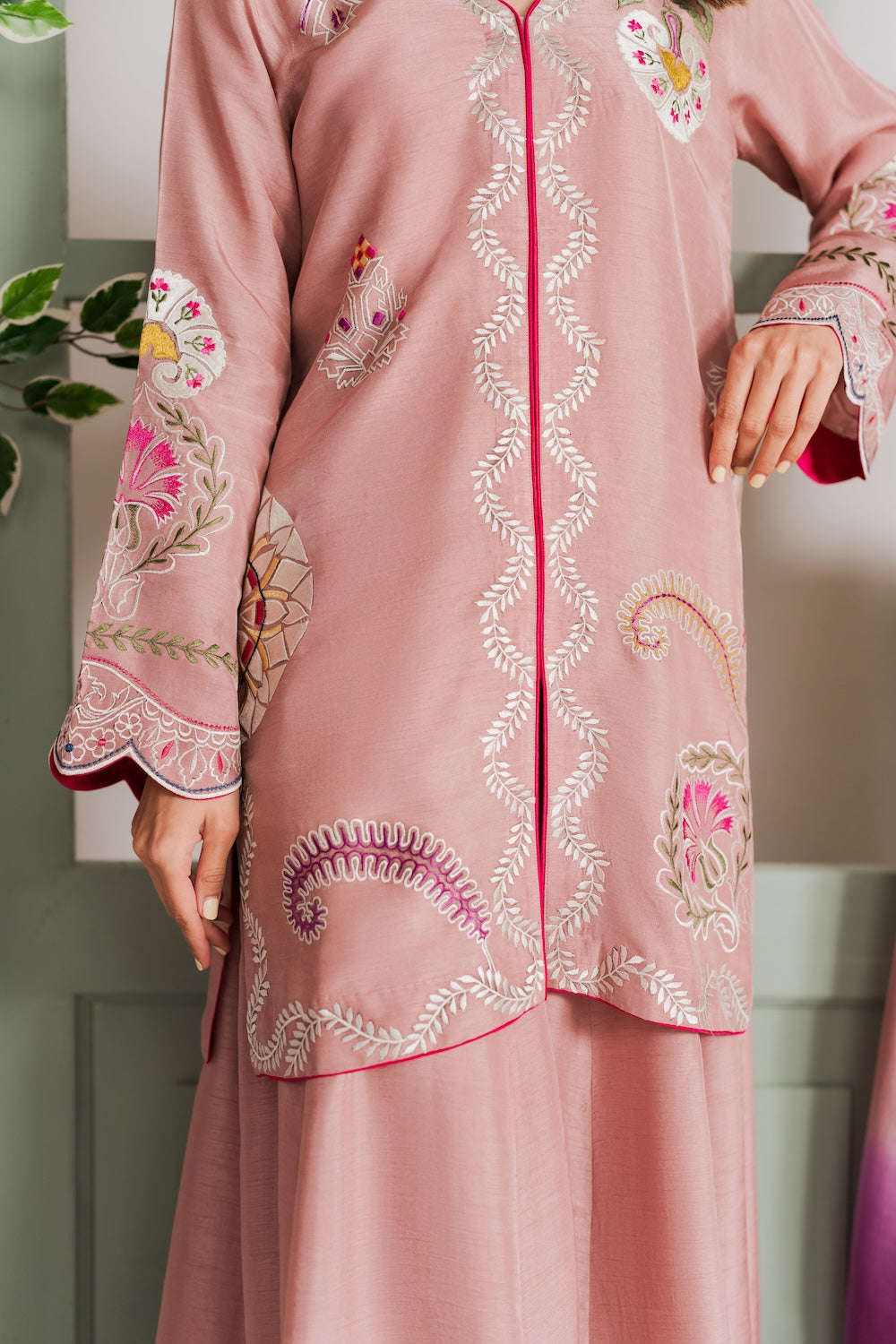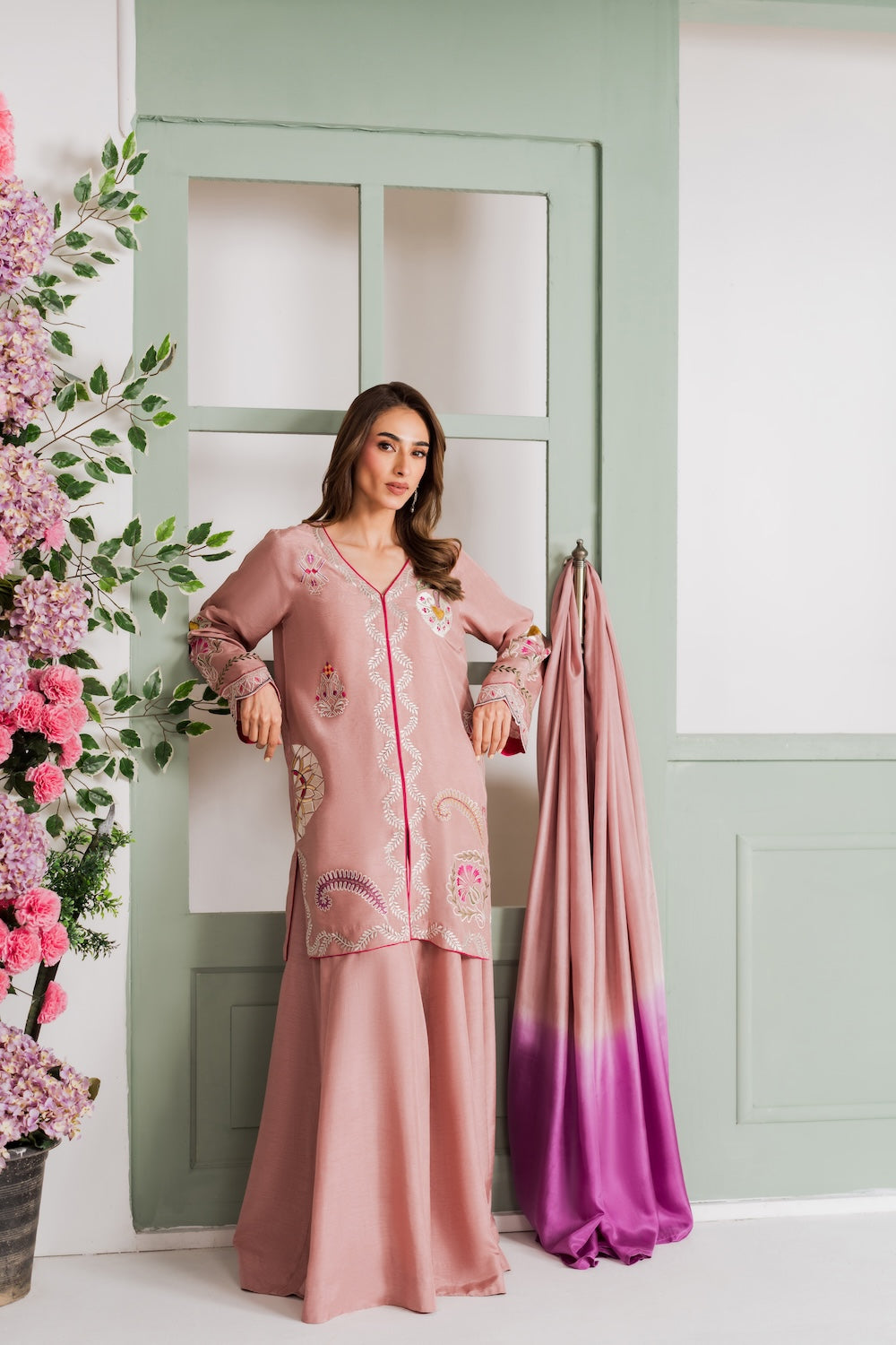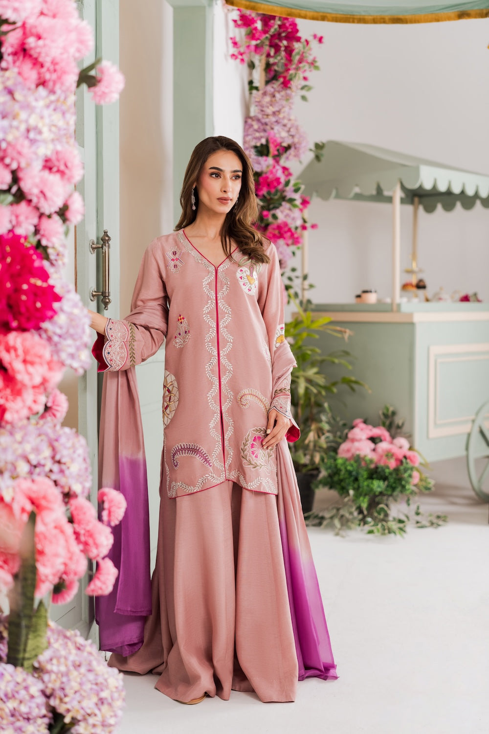 A refined beige colored two-piece outfit featuring delicate hand-aari embroidery on the shirt. Perfect for Eid, it reflects understated elegance and festive charm. The look can be elevated with a separately available silk embroidered dupatta for added grace.