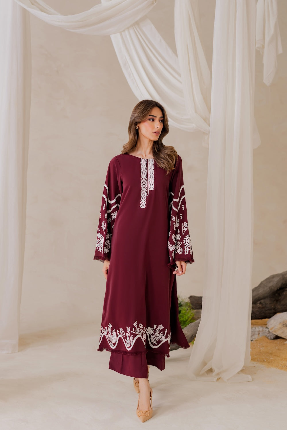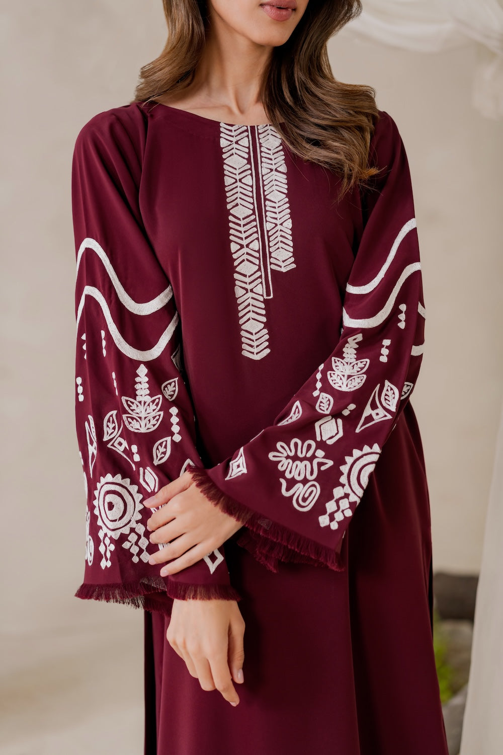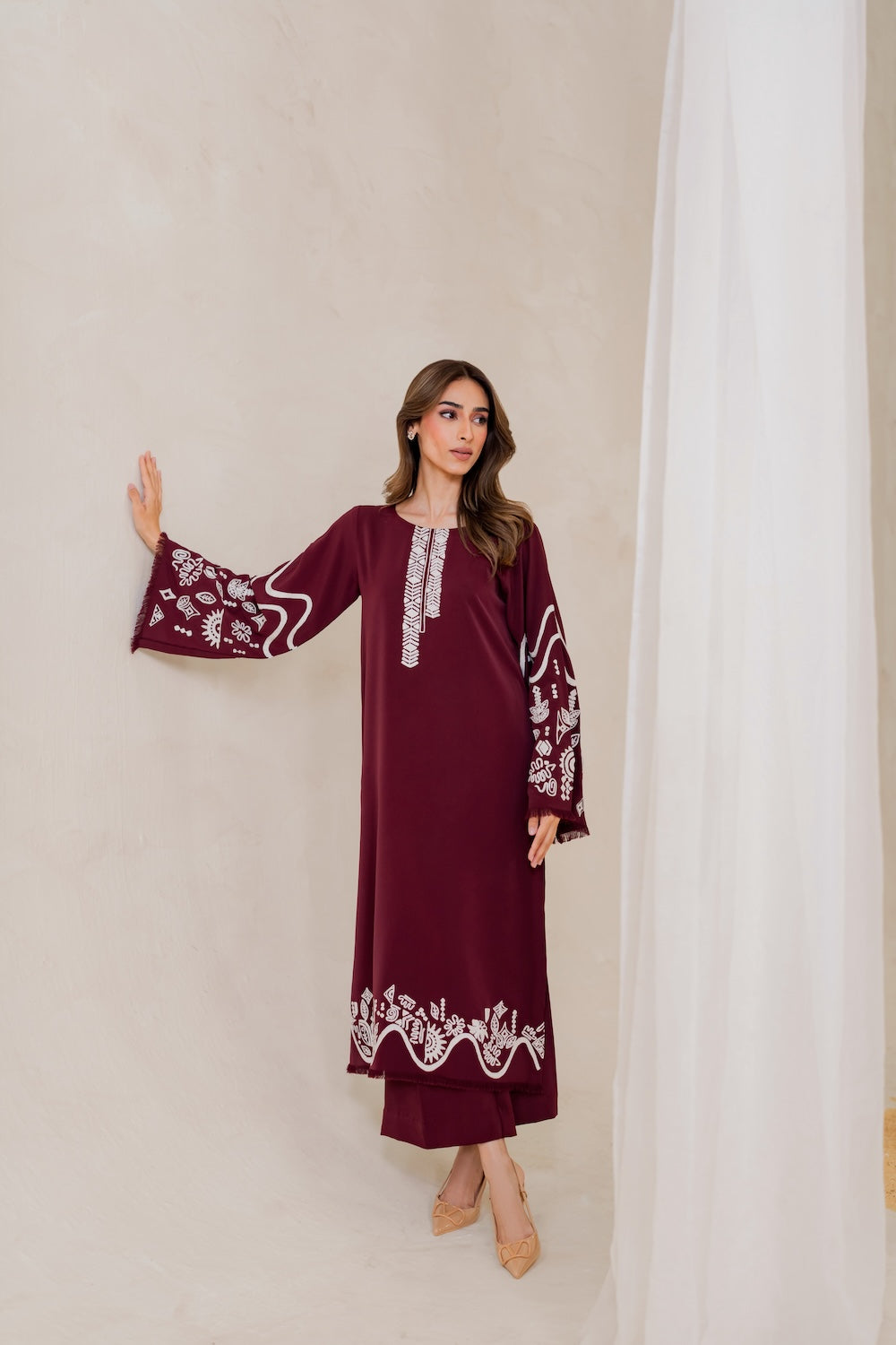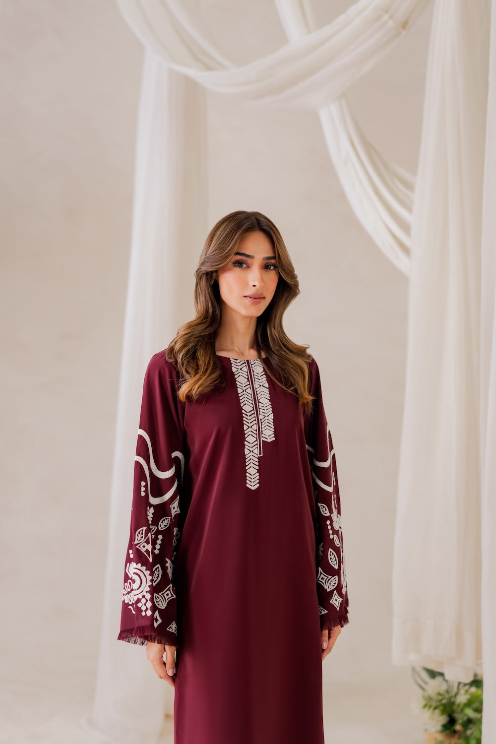 Maya's a stunner this season! The deep burgundy hue and subtle embroidery make for a show-stopping look that's hard to ignore. Whether you're dressing up or keeping it casual, you're sure to turn heads – it's a versatile piece that's sure to make a statement!