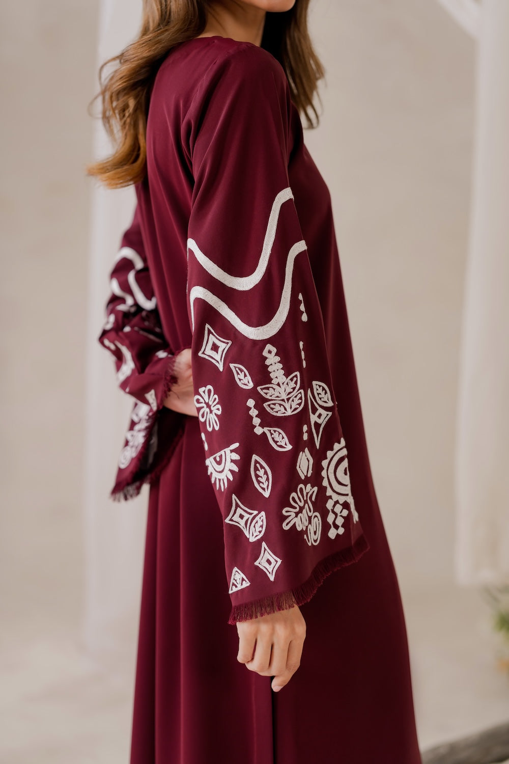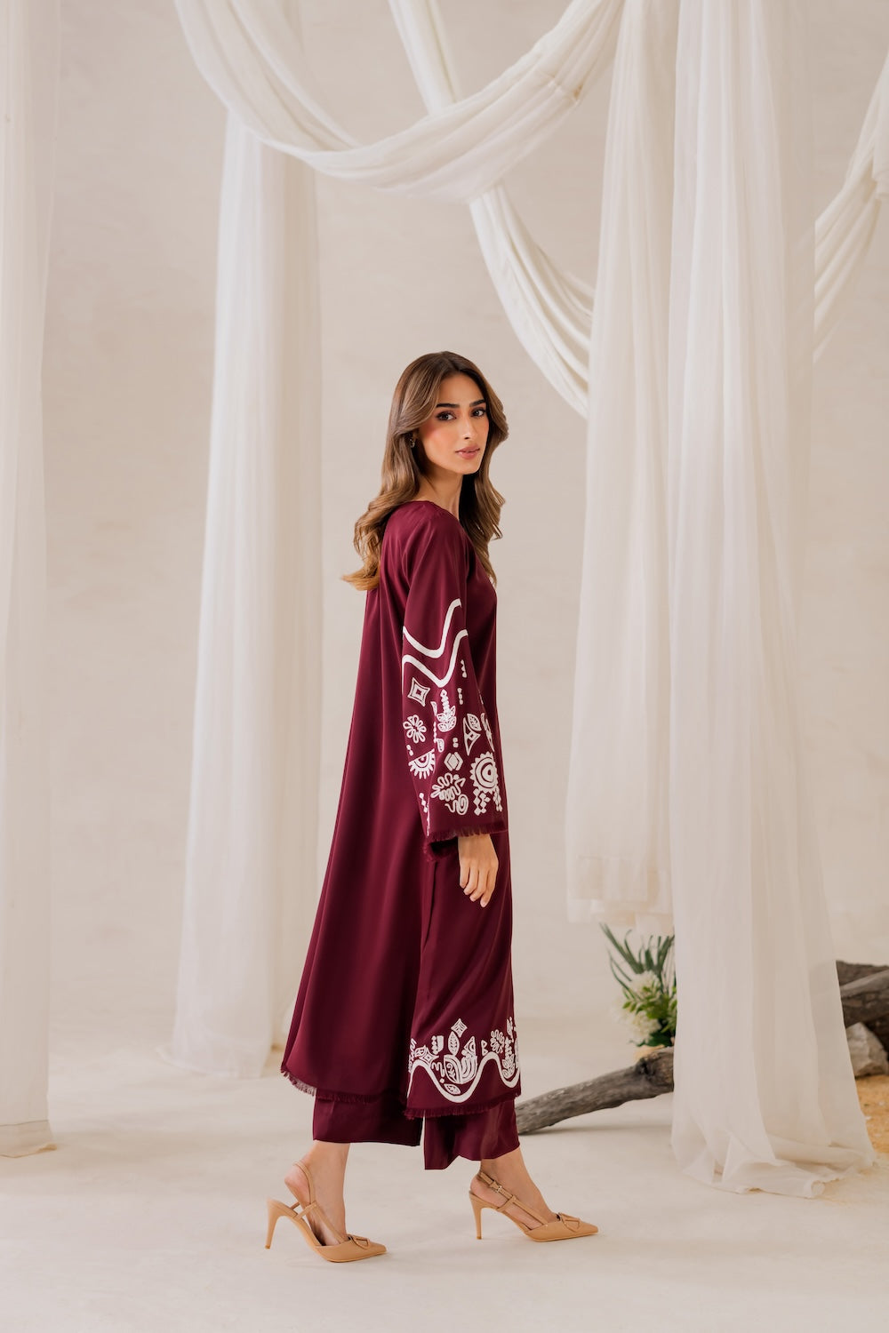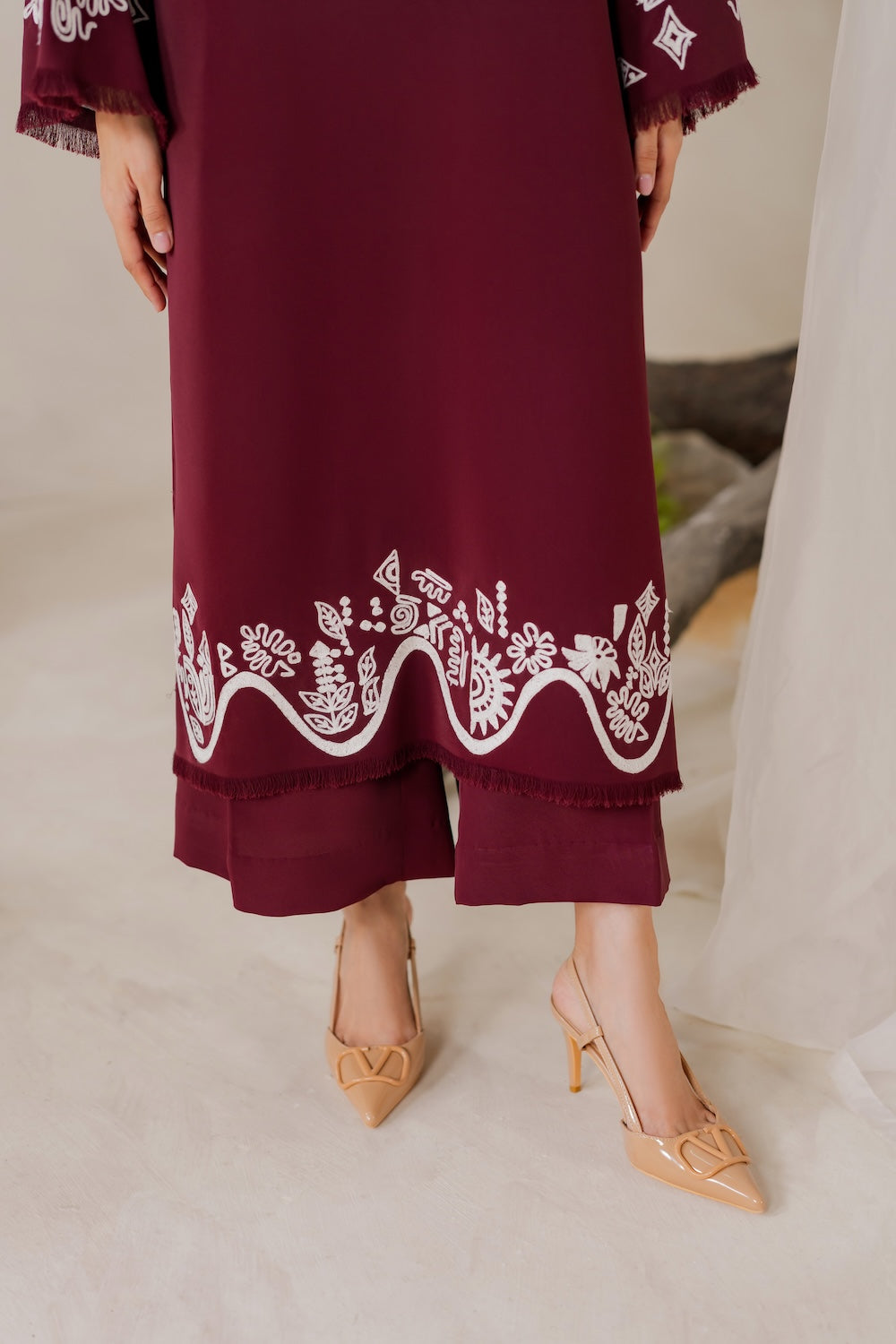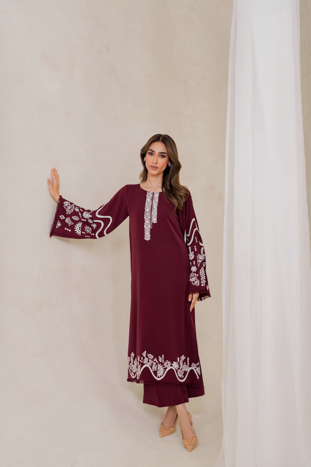 Maya's a stunner this season! The deep burgundy hue and subtle embroidery make for a show-stopping look that's hard to ignore. Whether you're dressing up or keeping it casual, you're sure to turn heads – it's a versatile piece that's sure to make a statement!