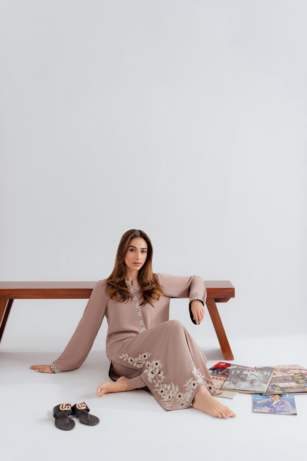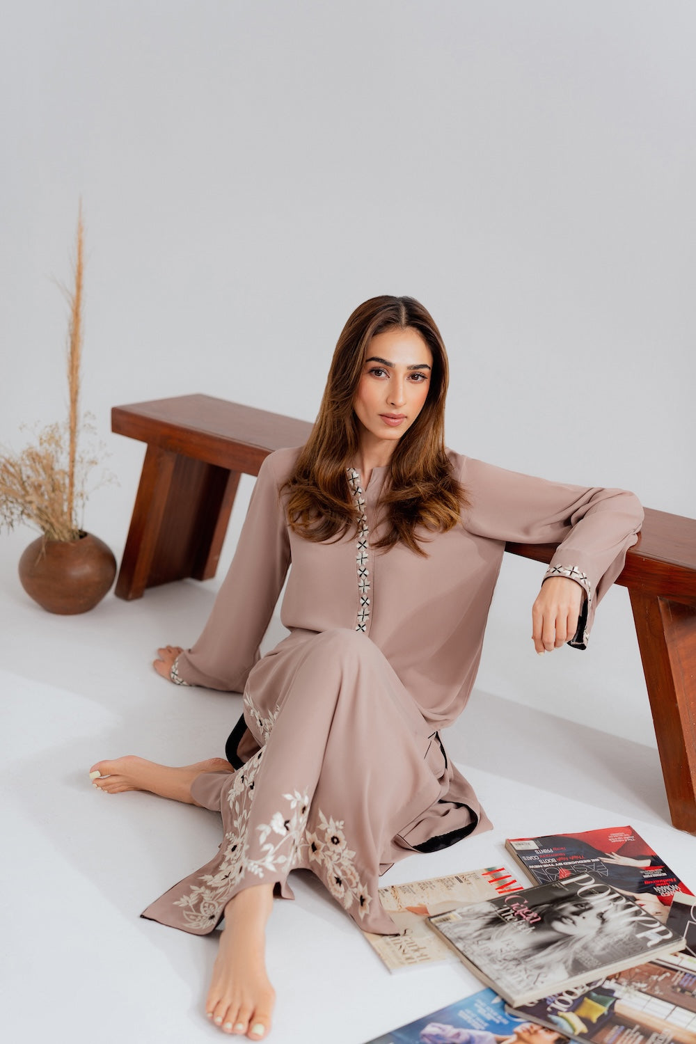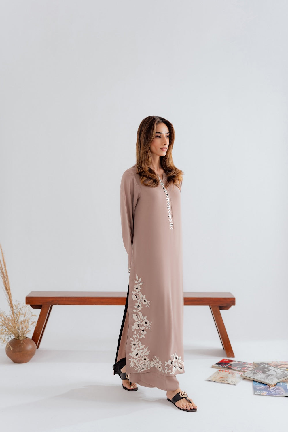 Understated yet undeniably elegant, this 2-piece beige outfit exudes modern sophistication. Adorned with intricate 3D embroidery on the daaman, sleeves, and neckline, the design adds texture and depth while keeping the look effortlessly refined. The soft neutral tone enhances its versatility, making it a timeless addition to any wardrobe. With its contemporary silhouette and luxurious detailing, this ensemble is perfect for the fashion-forward woman who appreciates subtle glamour.