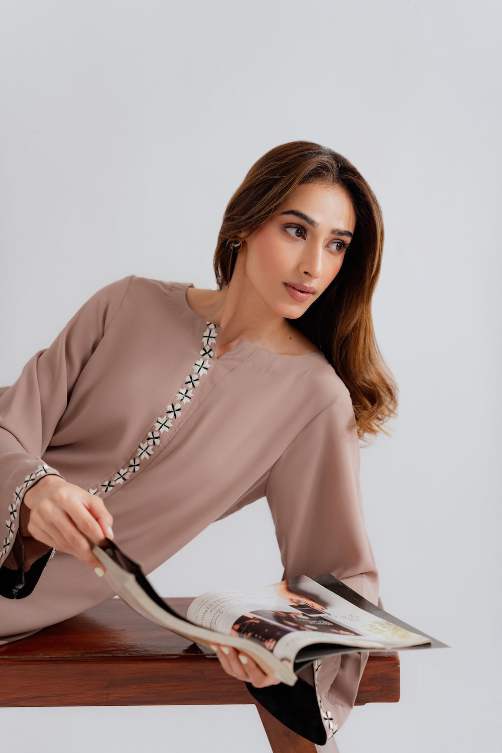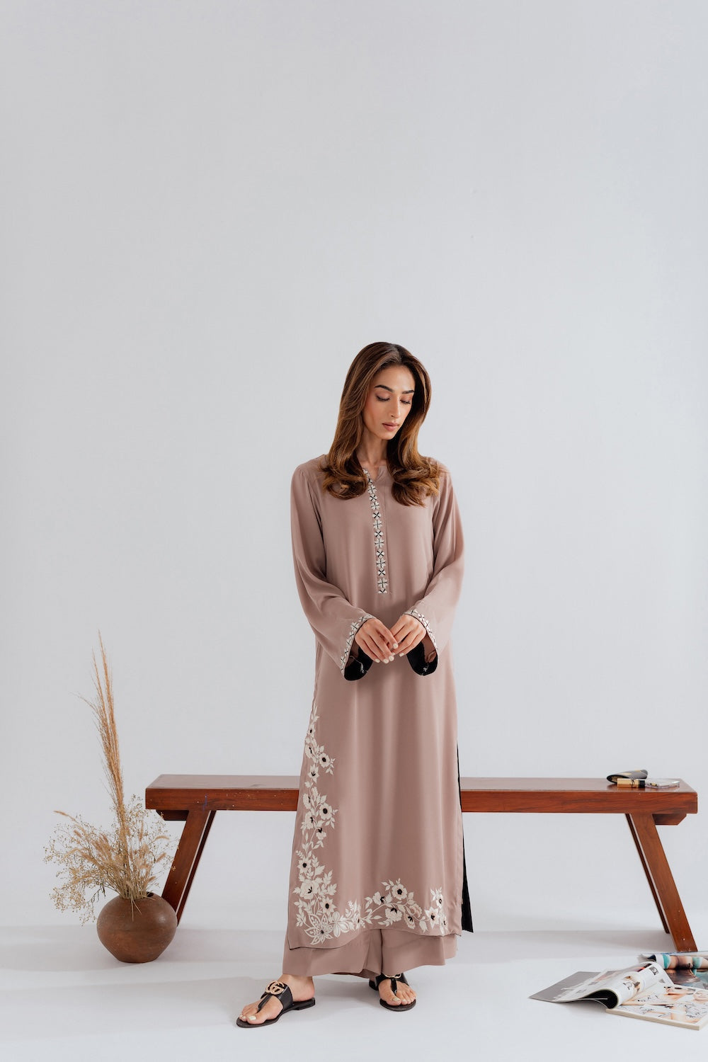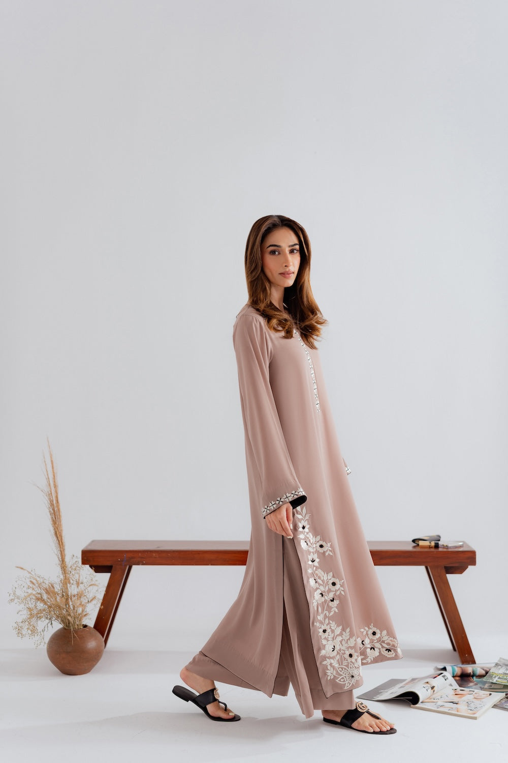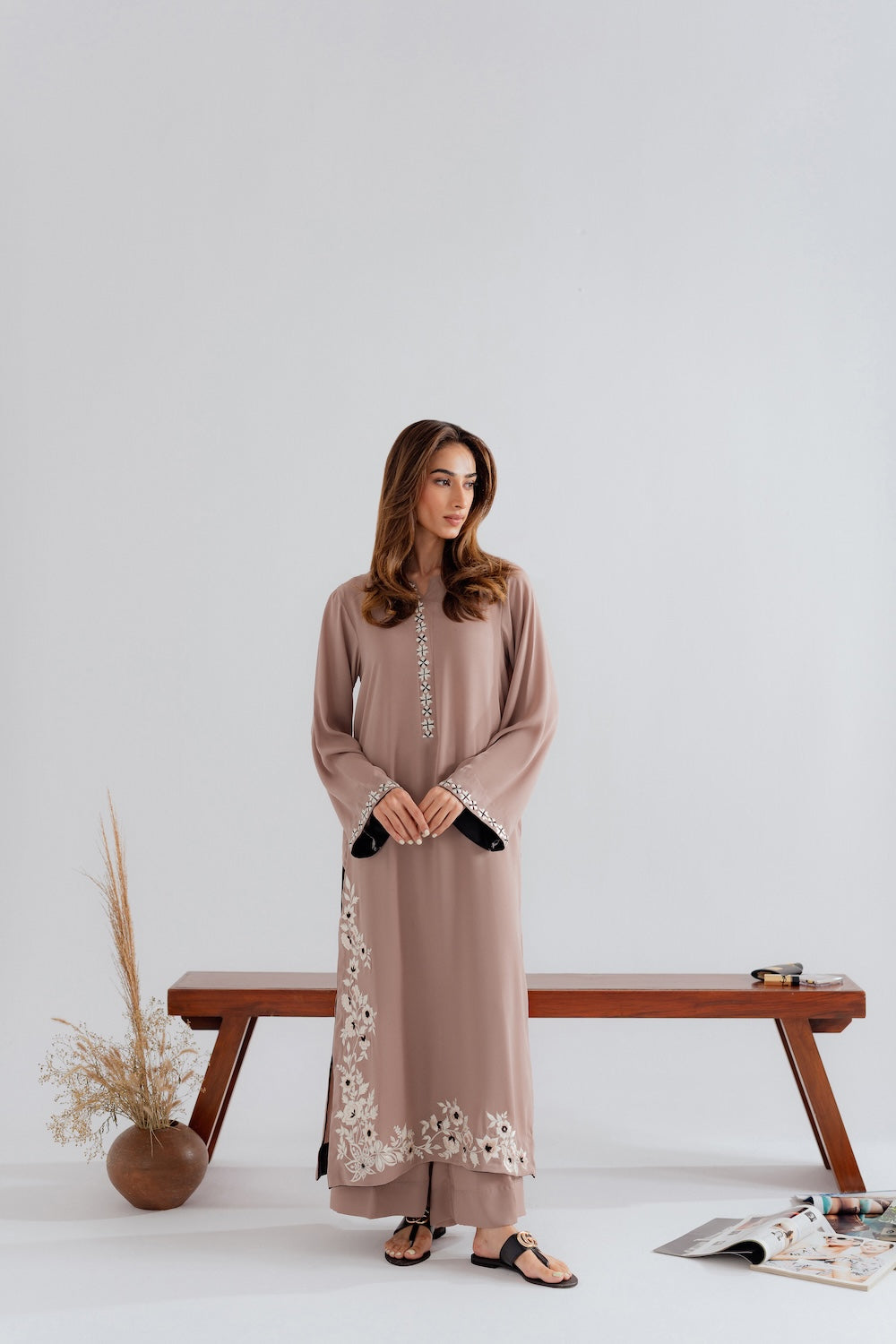 Understated yet undeniably elegant, this 2-piece beige outfit exudes modern sophistication. Adorned with intricate 3D embroidery on the daaman, sleeves, and neckline, the design adds texture and depth while keeping the look effortlessly refined. The soft neutral tone enhances its versatility, making it a timeless addition to any wardrobe. With its contemporary silhouette and luxurious detailing, this ensemble is perfect for the fashion-forward woman who appreciates subtle glamour.