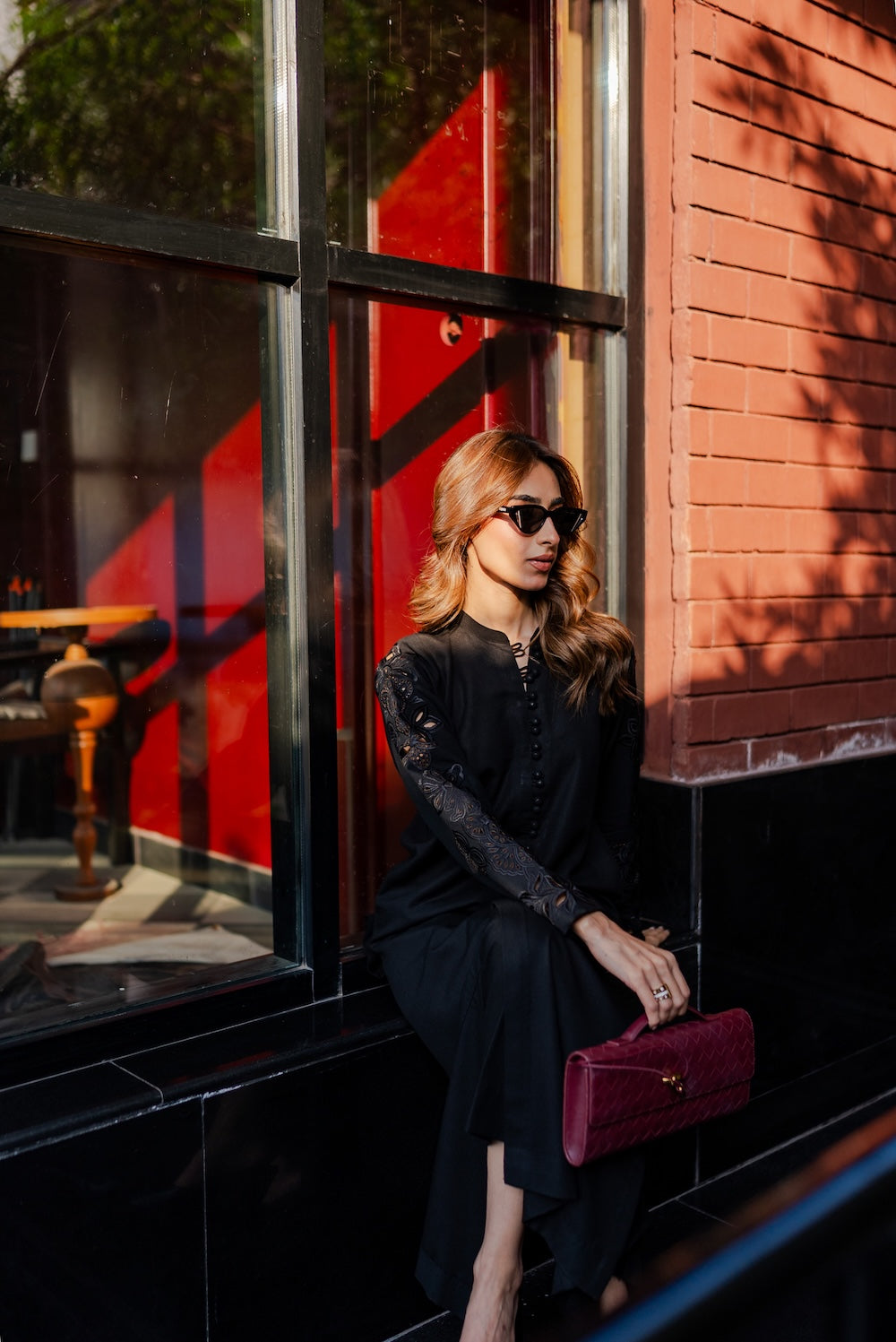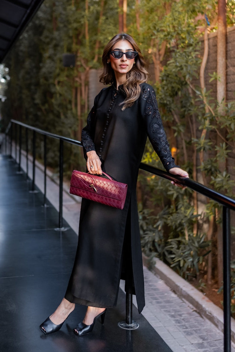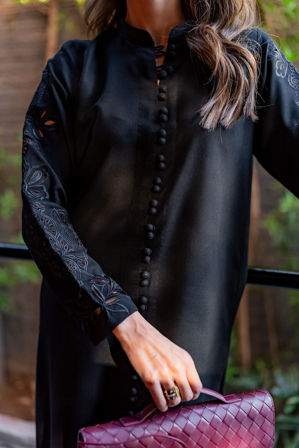 Make a statement at your next evening soiree with this stunning black outfit, featuring gorgeous cutwork embroidery on the sleeves. With its creaseless fabric, you can enjoy effortless elegance all night long, turning heads with every move.