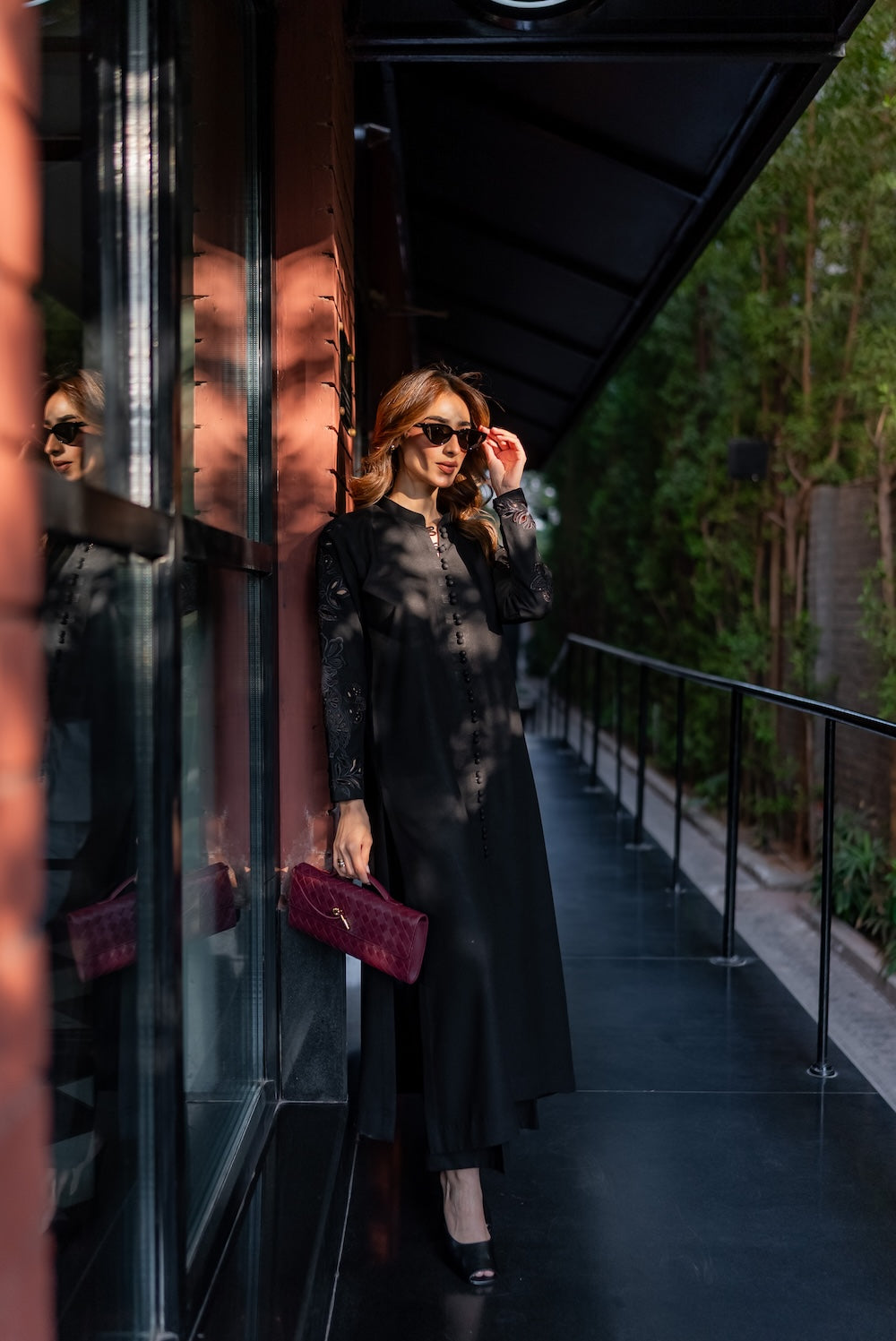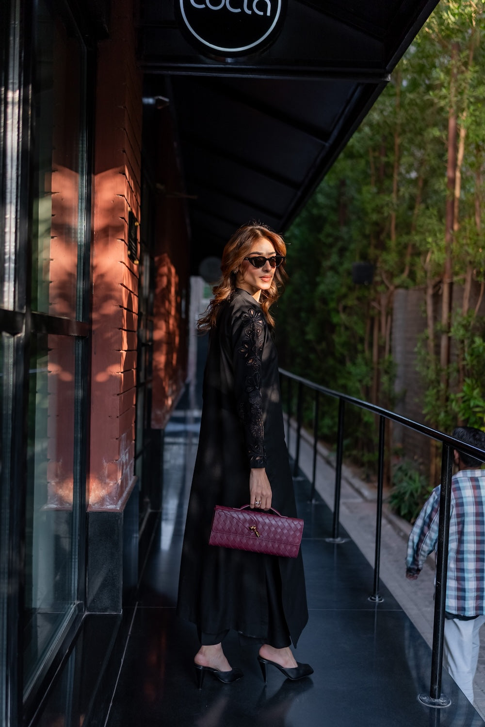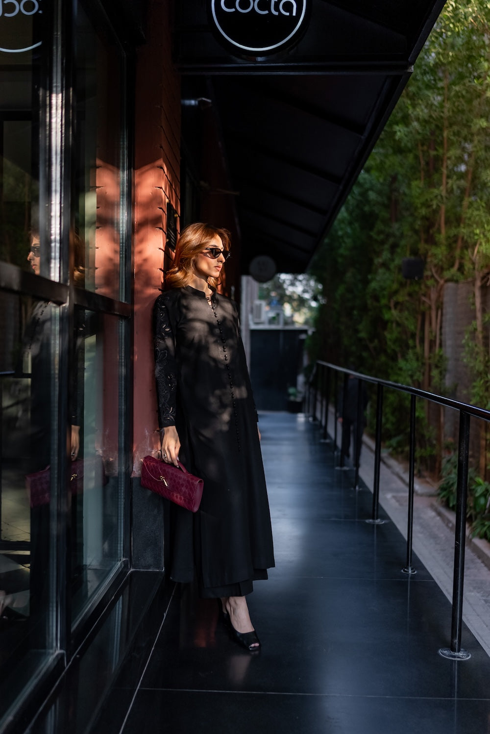 Make a statement at your next evening soiree with this stunning black outfit, featuring gorgeous cutwork embroidery on the sleeves. With its creaseless fabric, you can enjoy effortless elegance all night long, turning heads with every move.