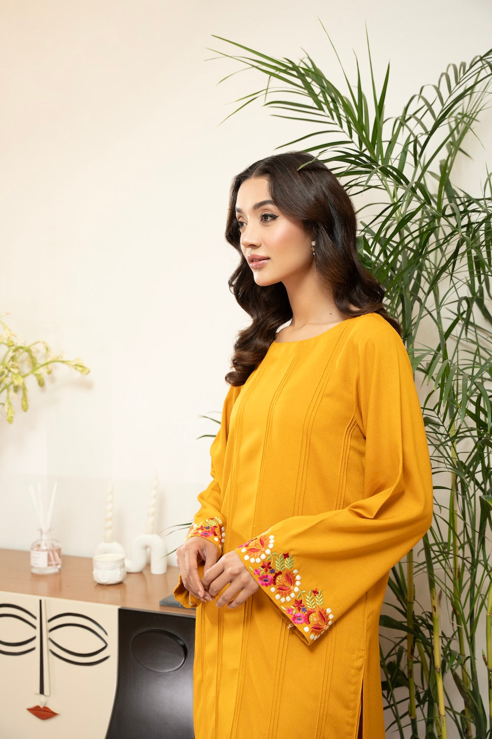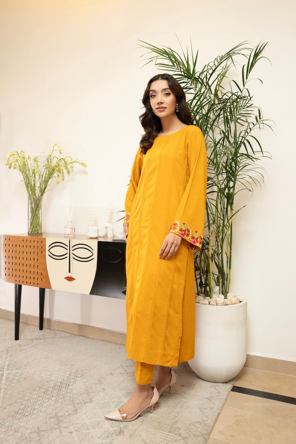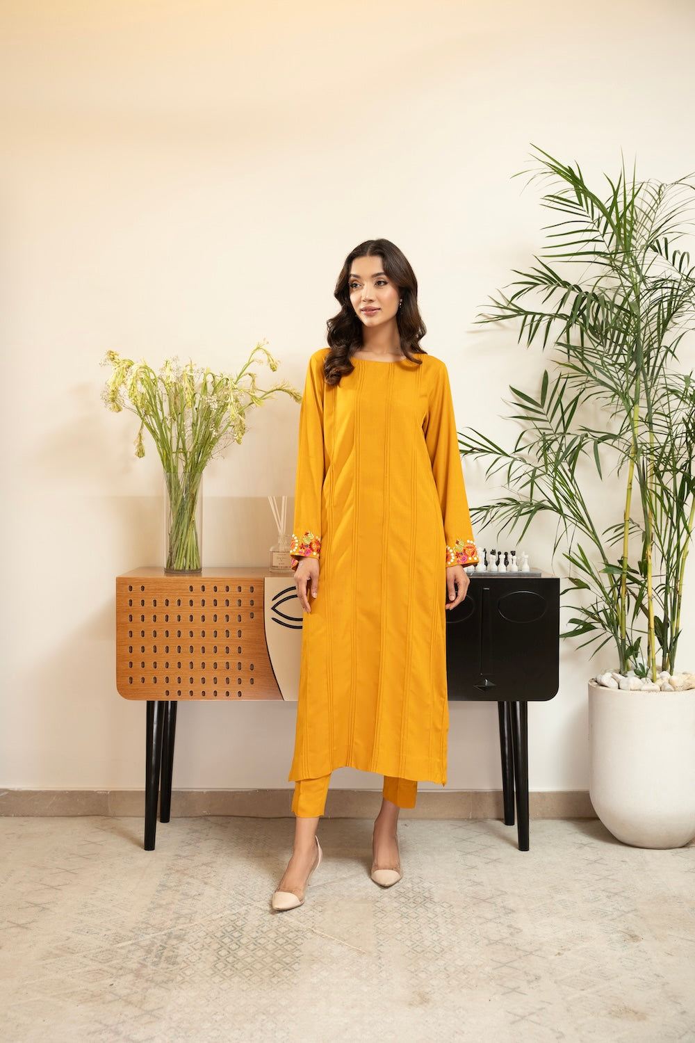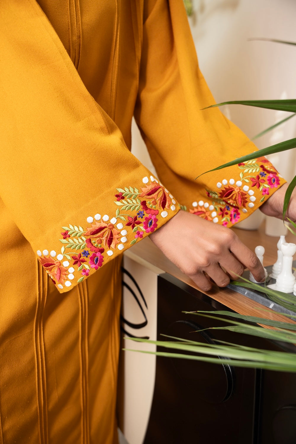 This ensemble is perfect for your everyday affairs. The pleated shirt with embroidered sleeves adds a perfect elegance to the whole look. Wear it on luncheons or your office affairs, it’s perfect for the women of today!