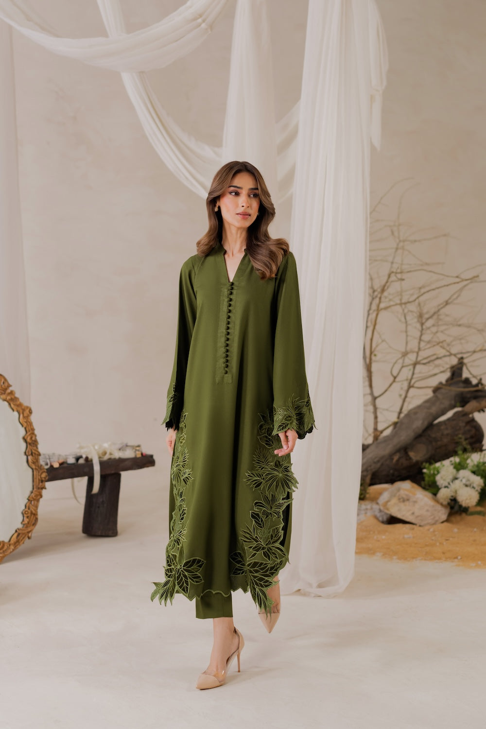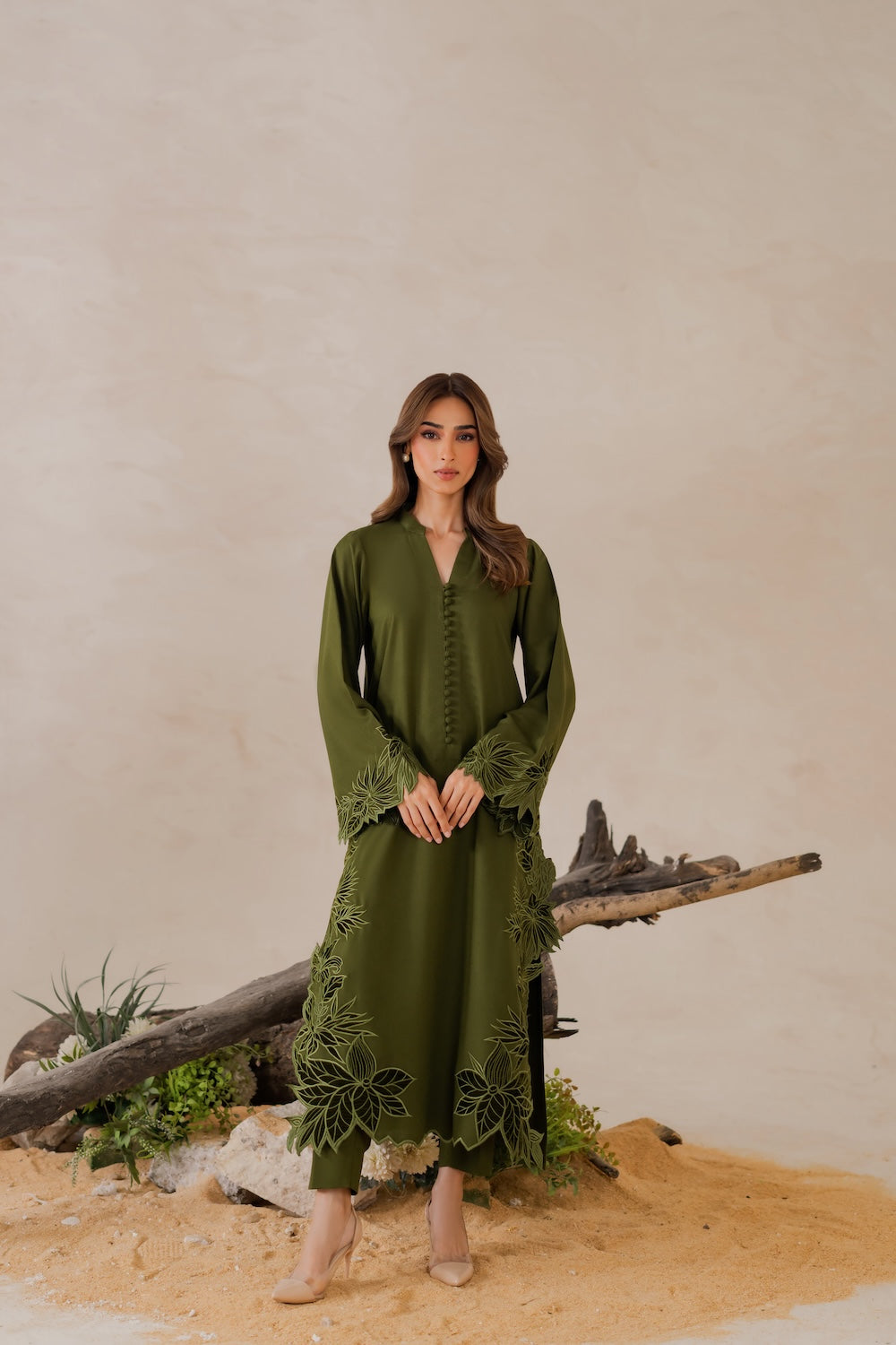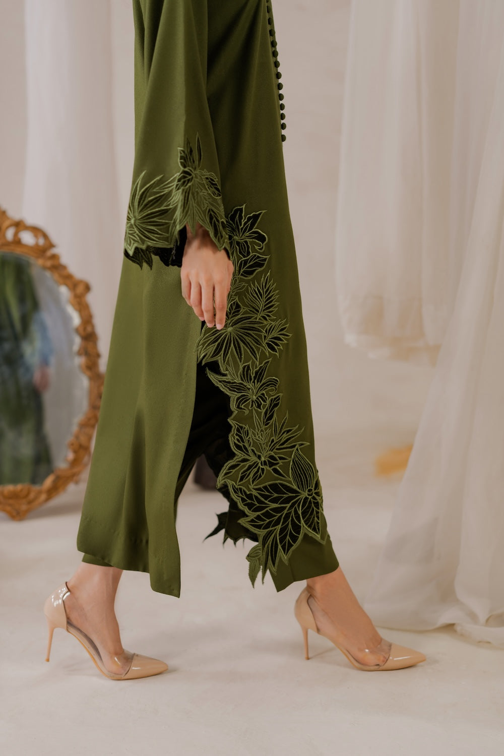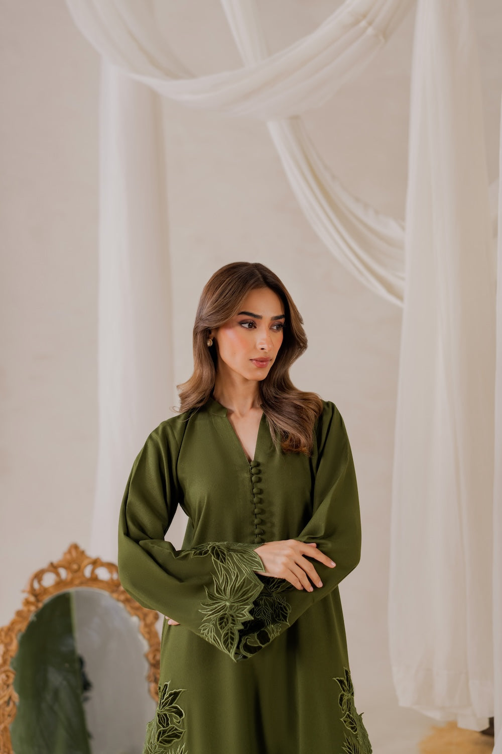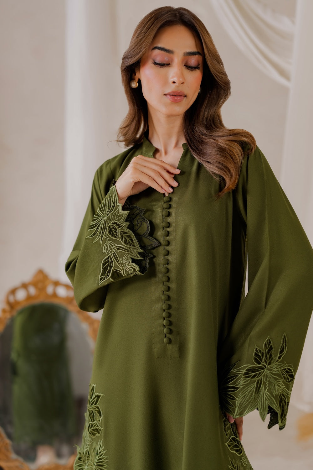This is not multi-head machine embroidery, it's individually and exclusively created by each karigar. Button design may or may not vary depending upon the availability of same as original design from the vendor. The model's height is 5.6" and wearing small size. Actual color may slightly vary from the shoot pictures due to controlled lighting used in the shoot and/or due to your screen resolution.