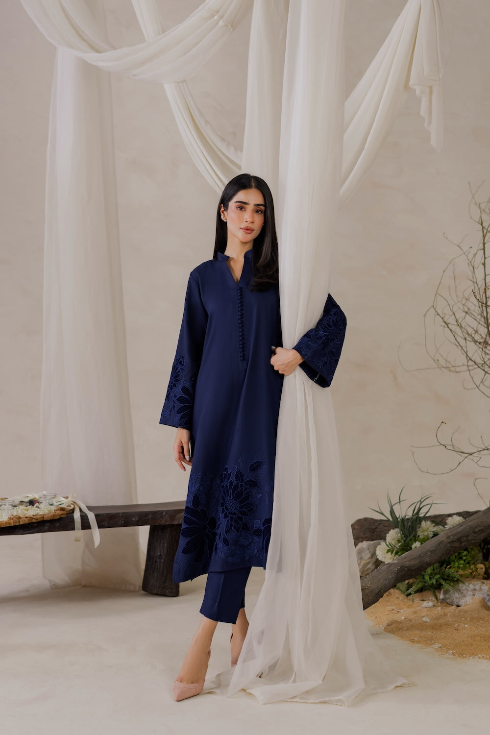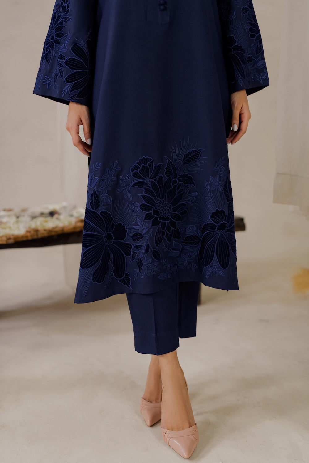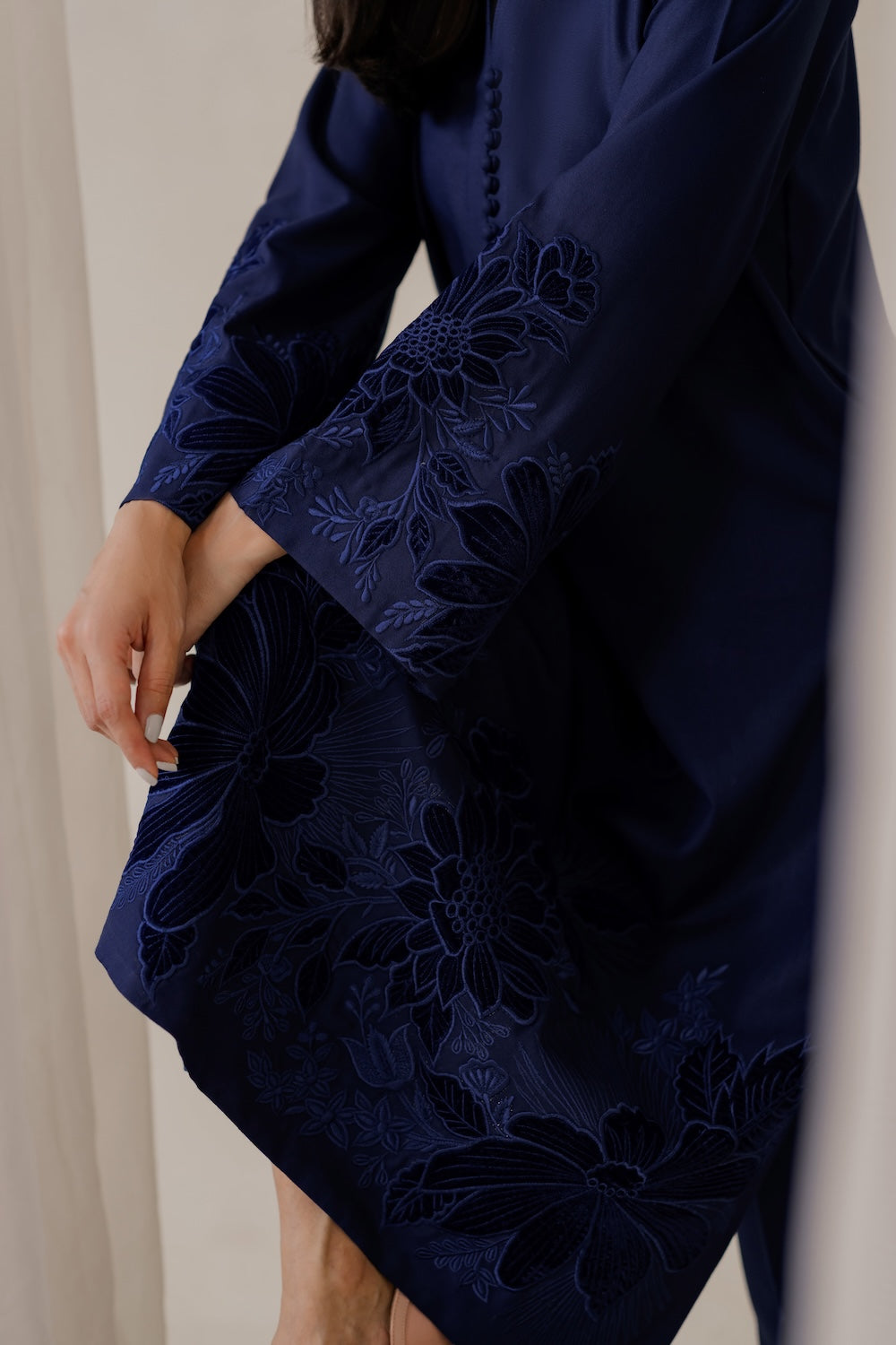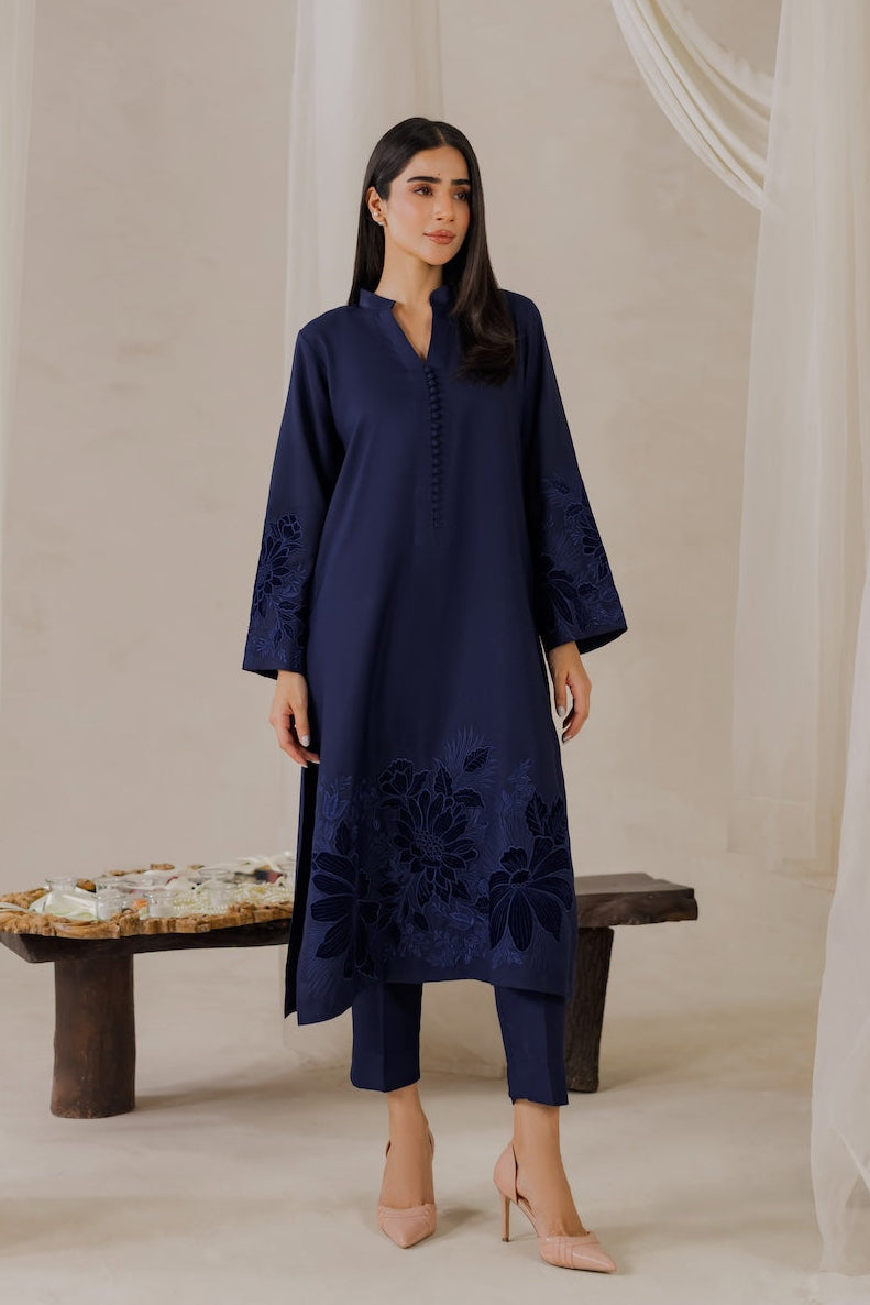 Elevate your winter wardrobe with this stunning navy blue karandi outfit, adorned with exquisite embroidery and luxurious velvet details. Perfect for the season, it exudes elegance and sophistication, making it a must-have for any winter occasion.