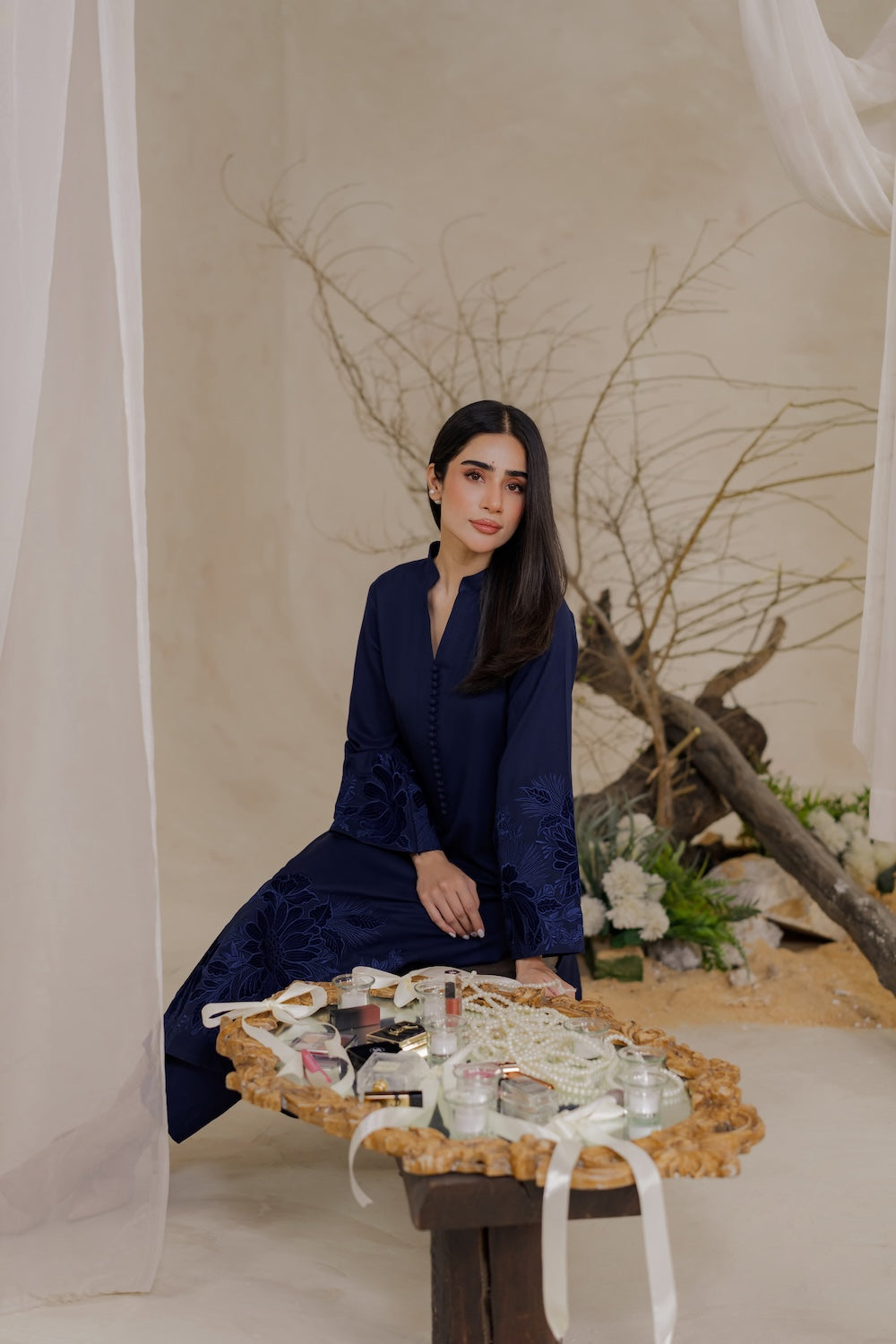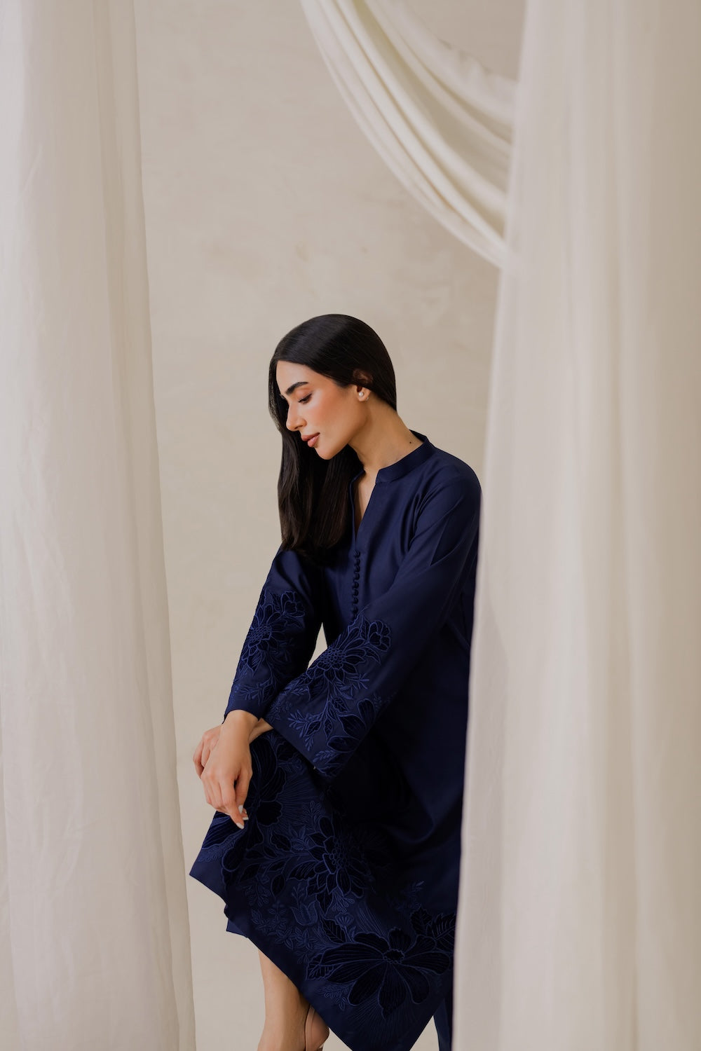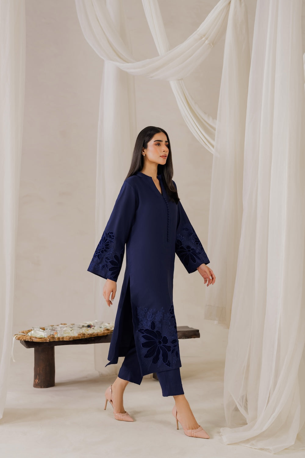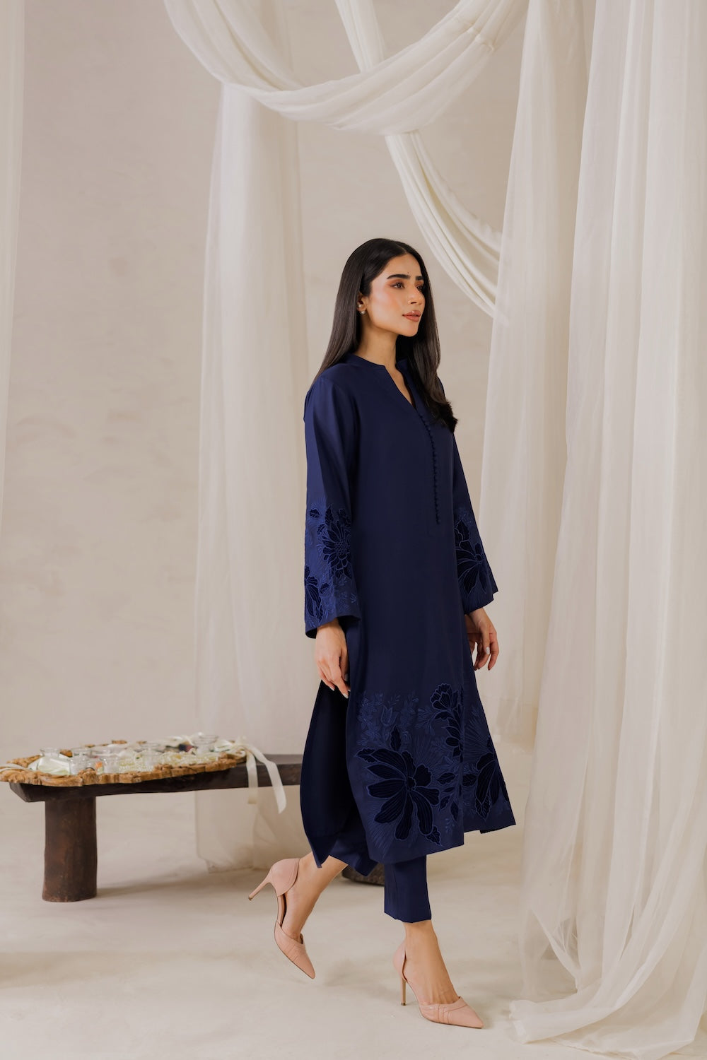 Elevate your winter wardrobe with this stunning navy blue karandi outfit, adorned with exquisite embroidery and luxurious velvet details. Perfect for the season, it exudes elegance and sophistication, making it a must-have for any winter occasion.