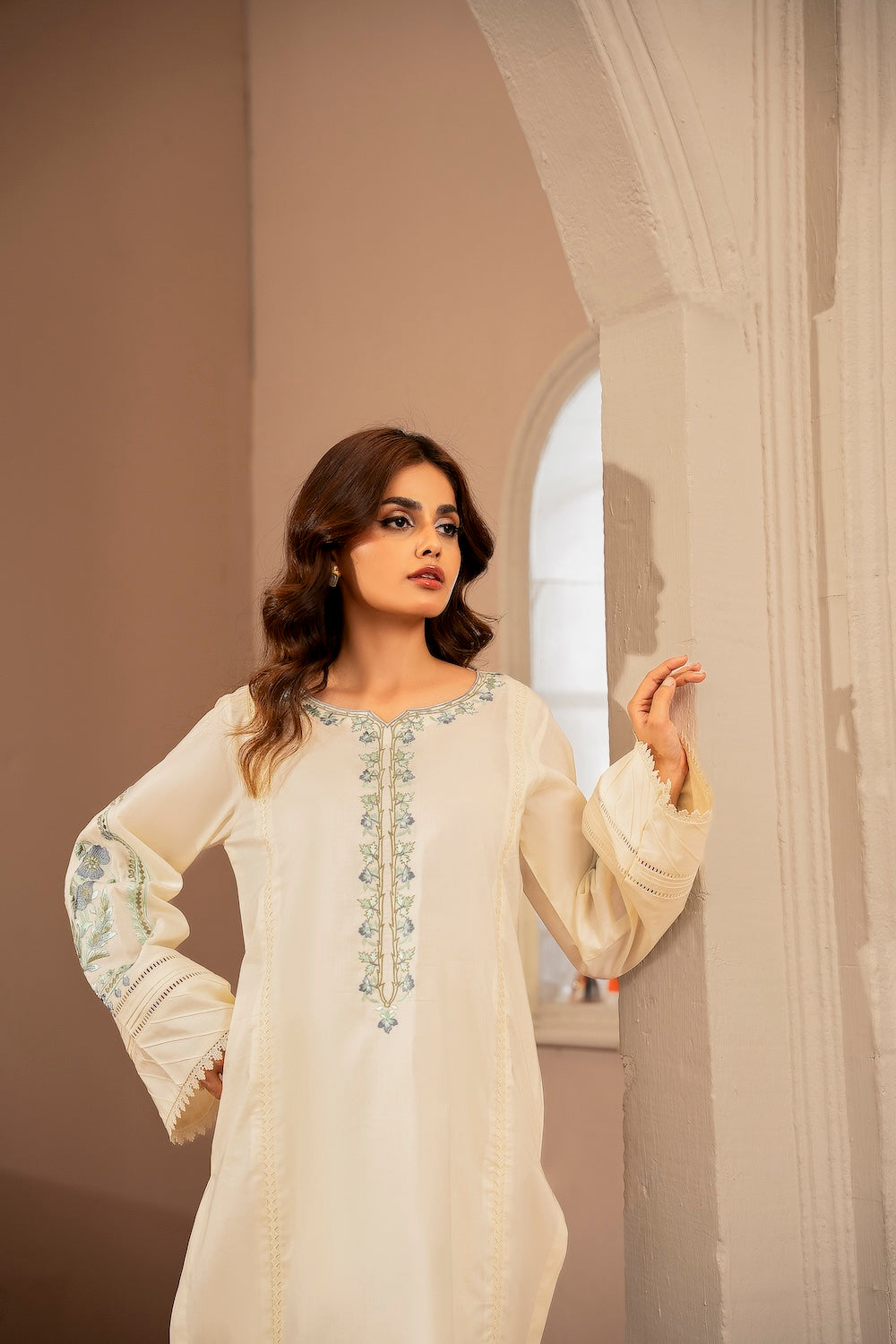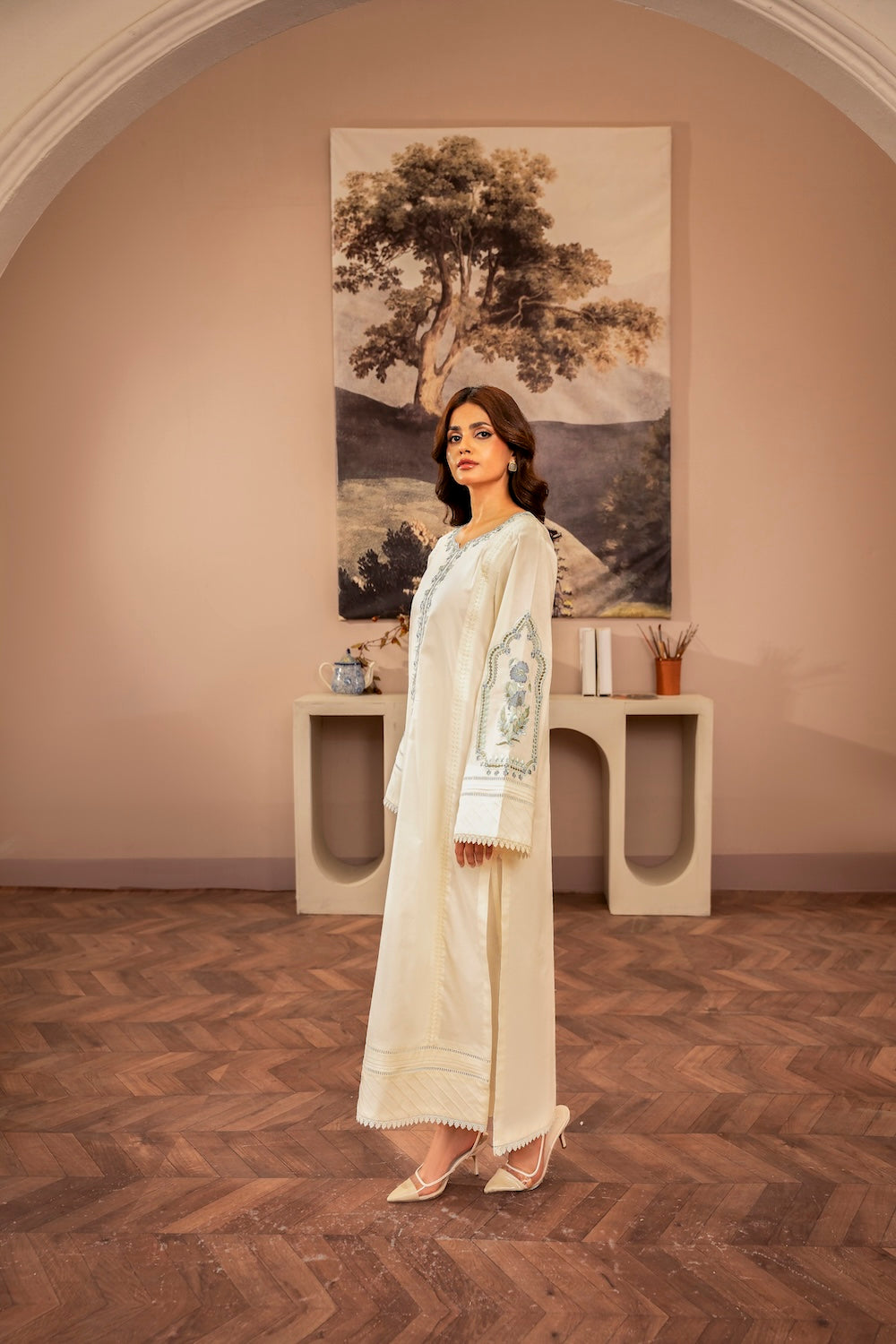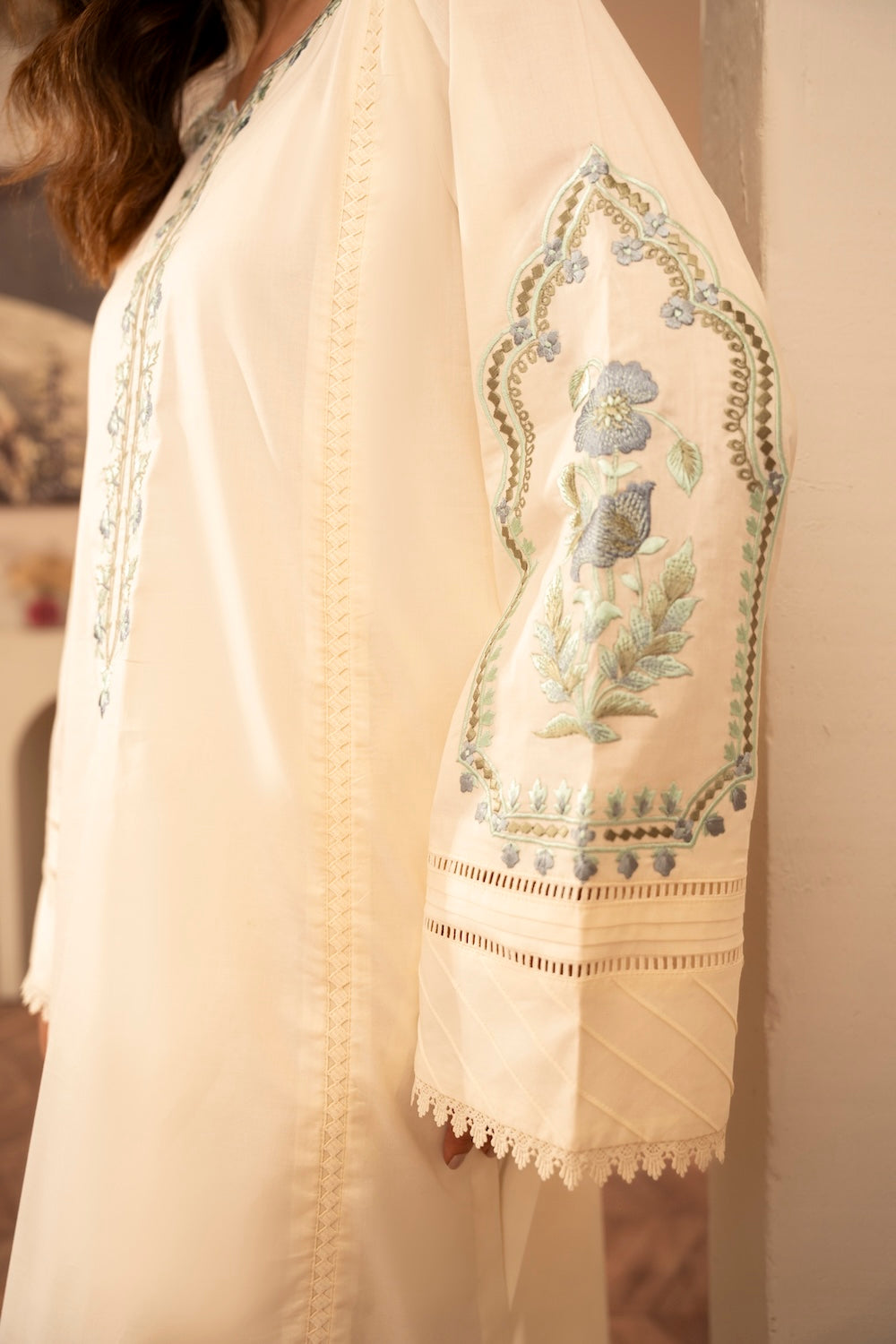 This elegant 2-piece stitched outfit in a soft off-white hue is adorned with traditional hand-machine embroidery in soothing shades of blue, offering a timeless and refreshing aesthetic. The straight-cut kameez features intricately embroidered floral and paisley motifs in light to deep blues, delicately placed along the neckline and sleeves. Fine lace detailing on the borders and sleeves adds a touch of femininity and texture, enhancing the overall charm of the design. Paired with matching straight trousers, the outfit is crafted from breathable, high-quality lawn fabric—making it an ideal choice for day functions, or elegant summer gatherings.