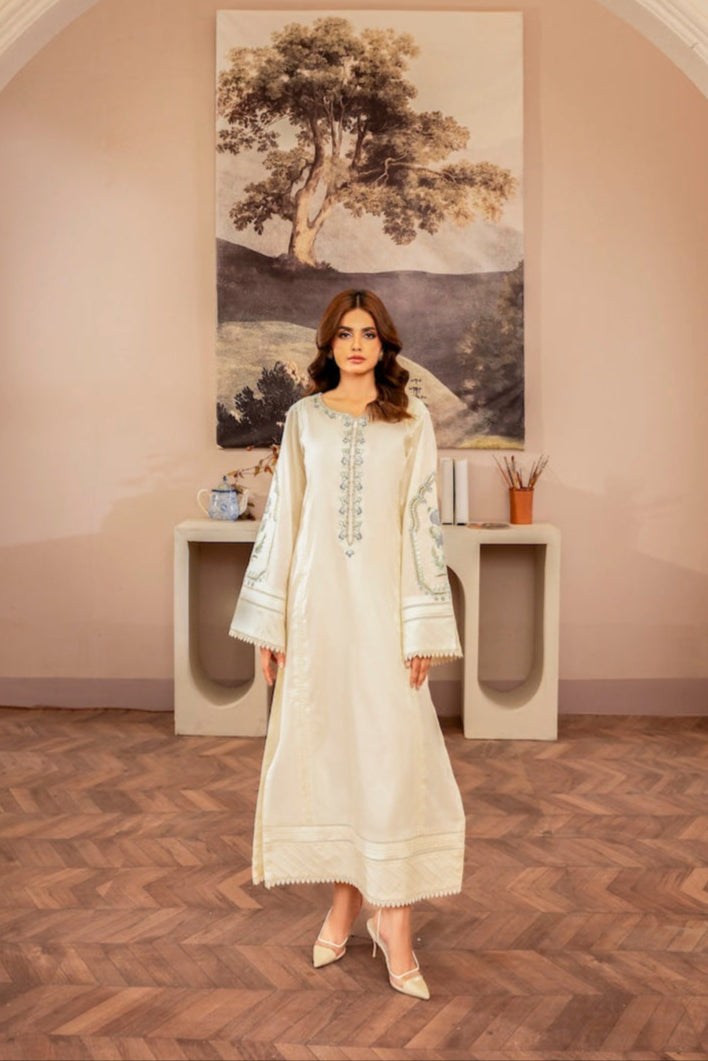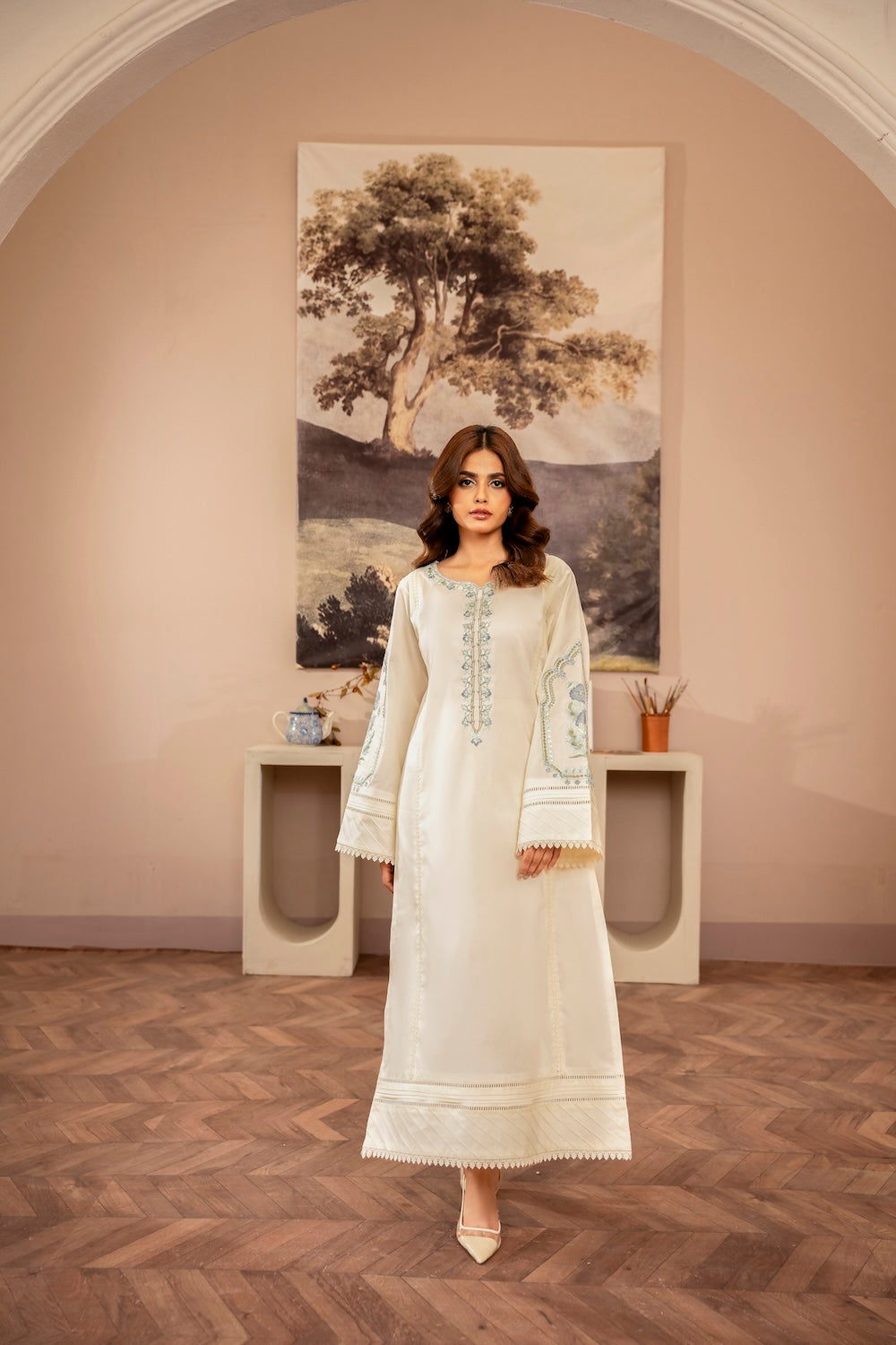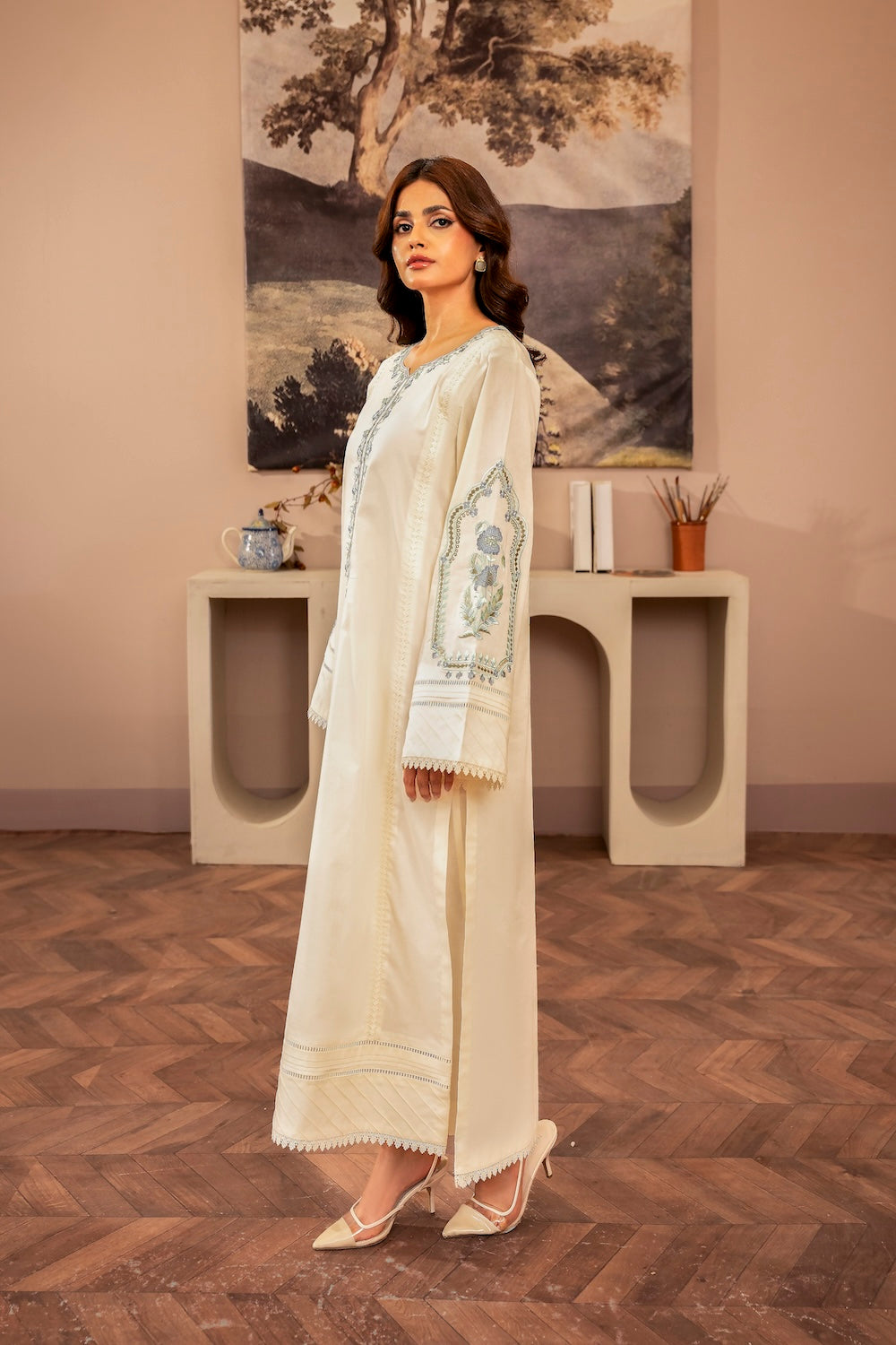 This elegant 2-piece stitched outfit in a soft off-white hue is adorned with traditional hand-machine embroidery in soothing shades of blue, offering a timeless and refreshing aesthetic. The straight-cut kameez features intricately embroidered floral and paisley motifs in light to deep blues, delicately placed along the neckline and sleeves. Fine lace detailing on the borders and sleeves adds a touch of femininity and texture, enhancing the overall charm of the design. Paired with matching straight trousers, the outfit is crafted from breathable, high-quality lawn fabric—making it an ideal choice for day functions, or elegant summer gatherings.