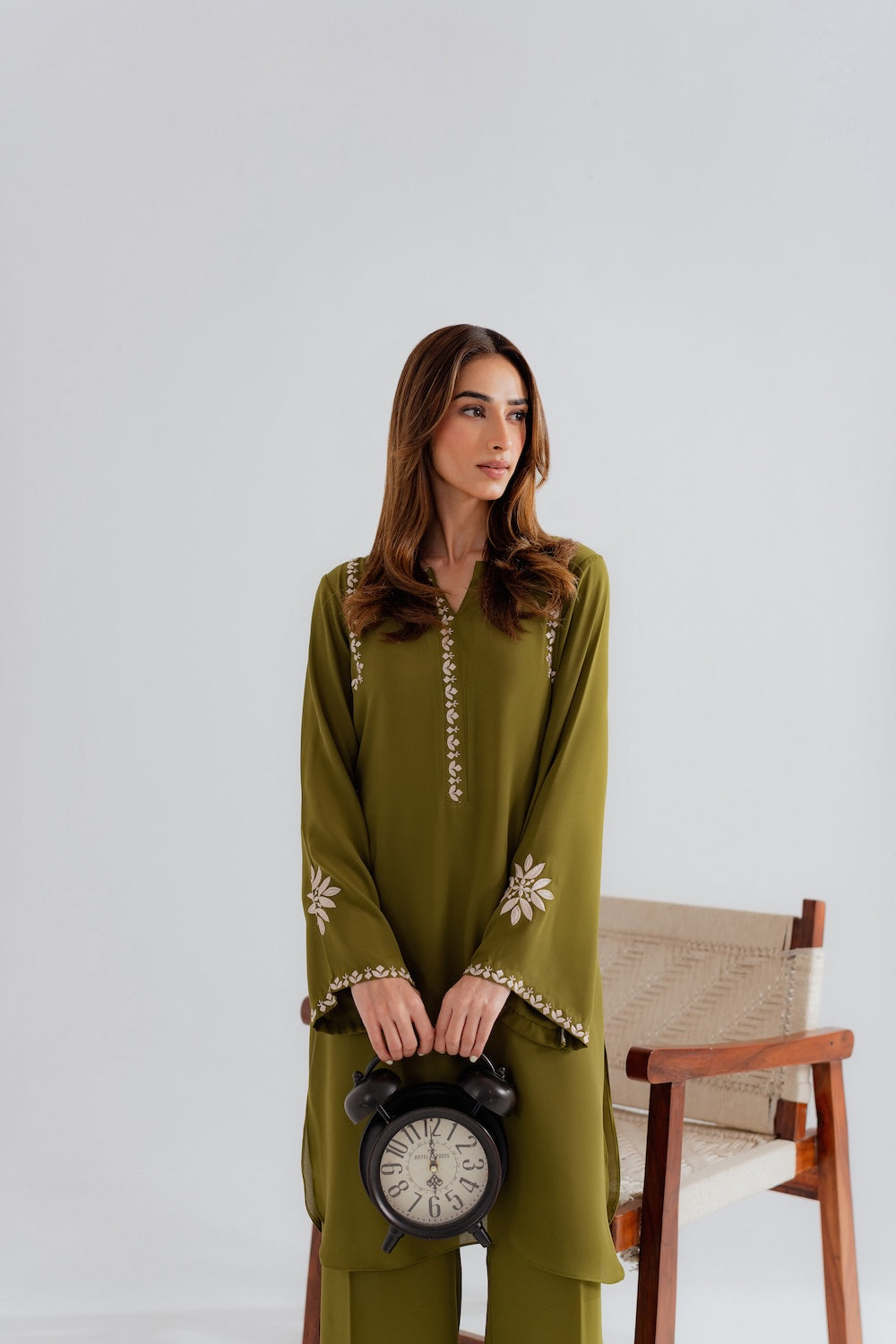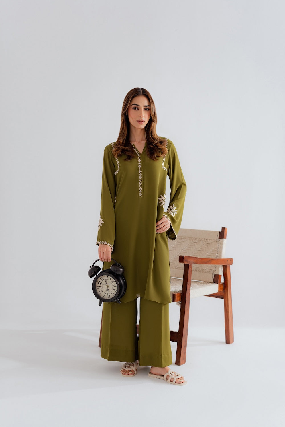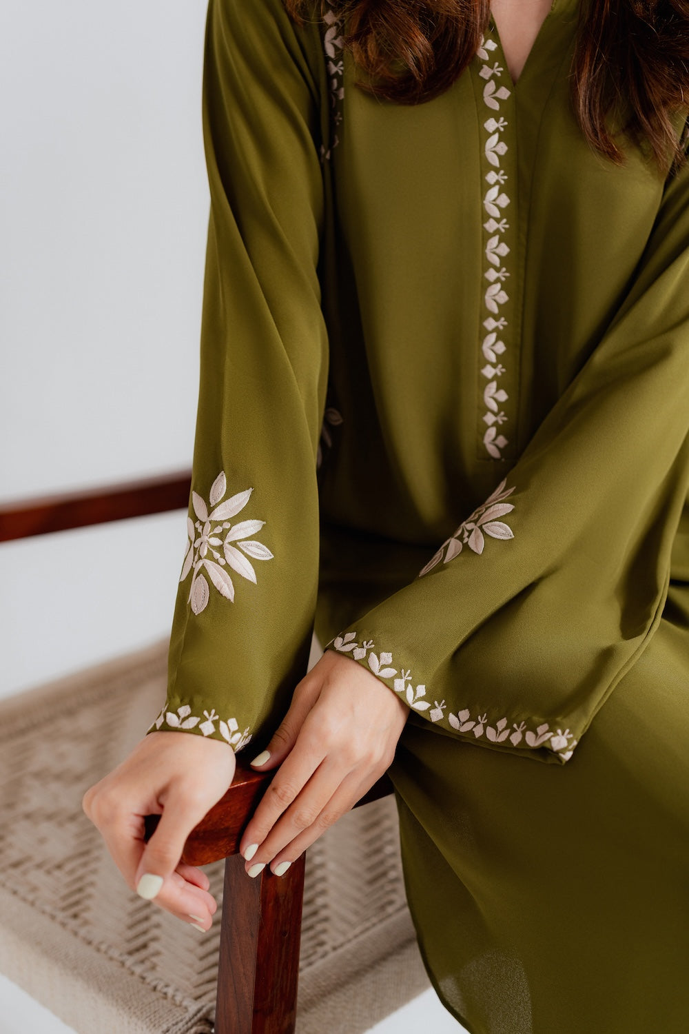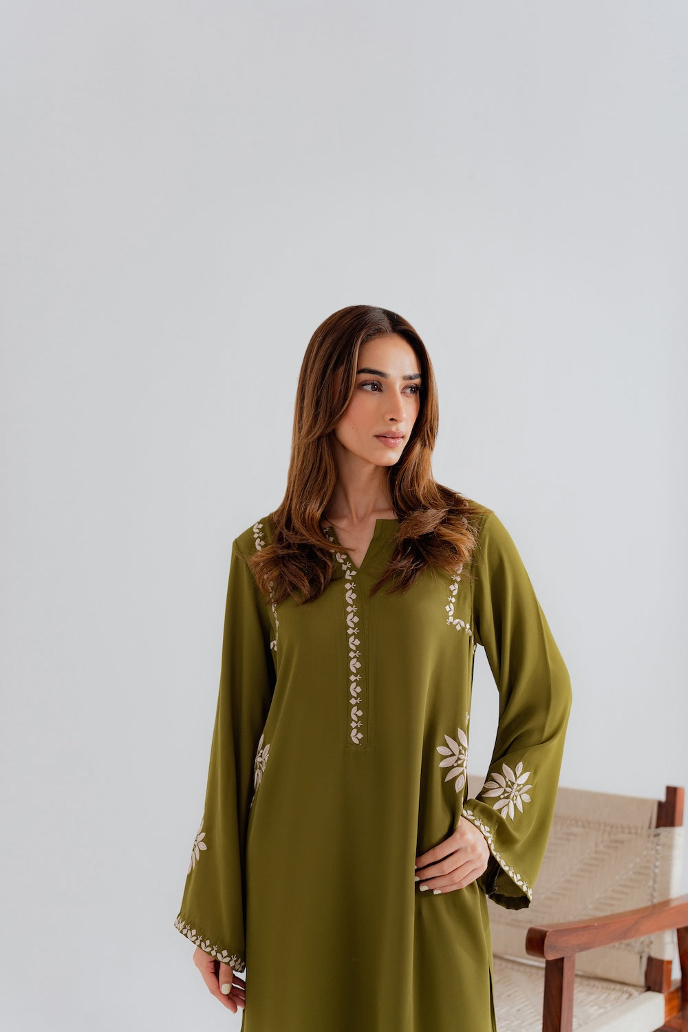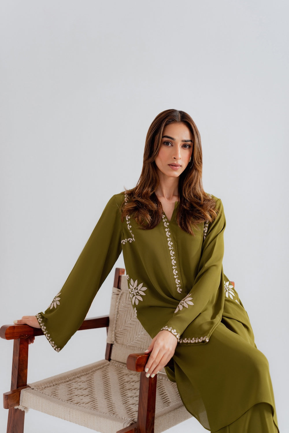 Effortlessly chic and refreshingly modern, this 2-piece olive green outfit is the perfect blend of simplicity and style. Designed with minimal embroidery on the sleeves, neckline, and pockets, it offers a clean, contemporary look with just the right hint of detail. The rich olive tone adds depth and versatility, making it an ideal choice for both casual outings and elevated daywear. A must-have for those who love understated elegance with a modern edge.