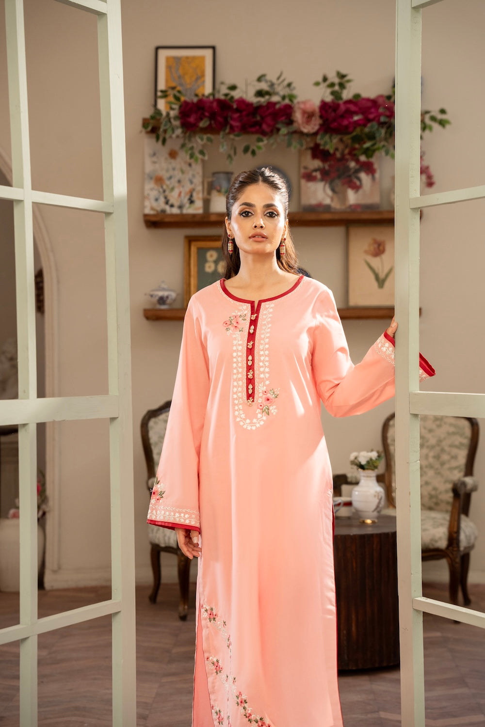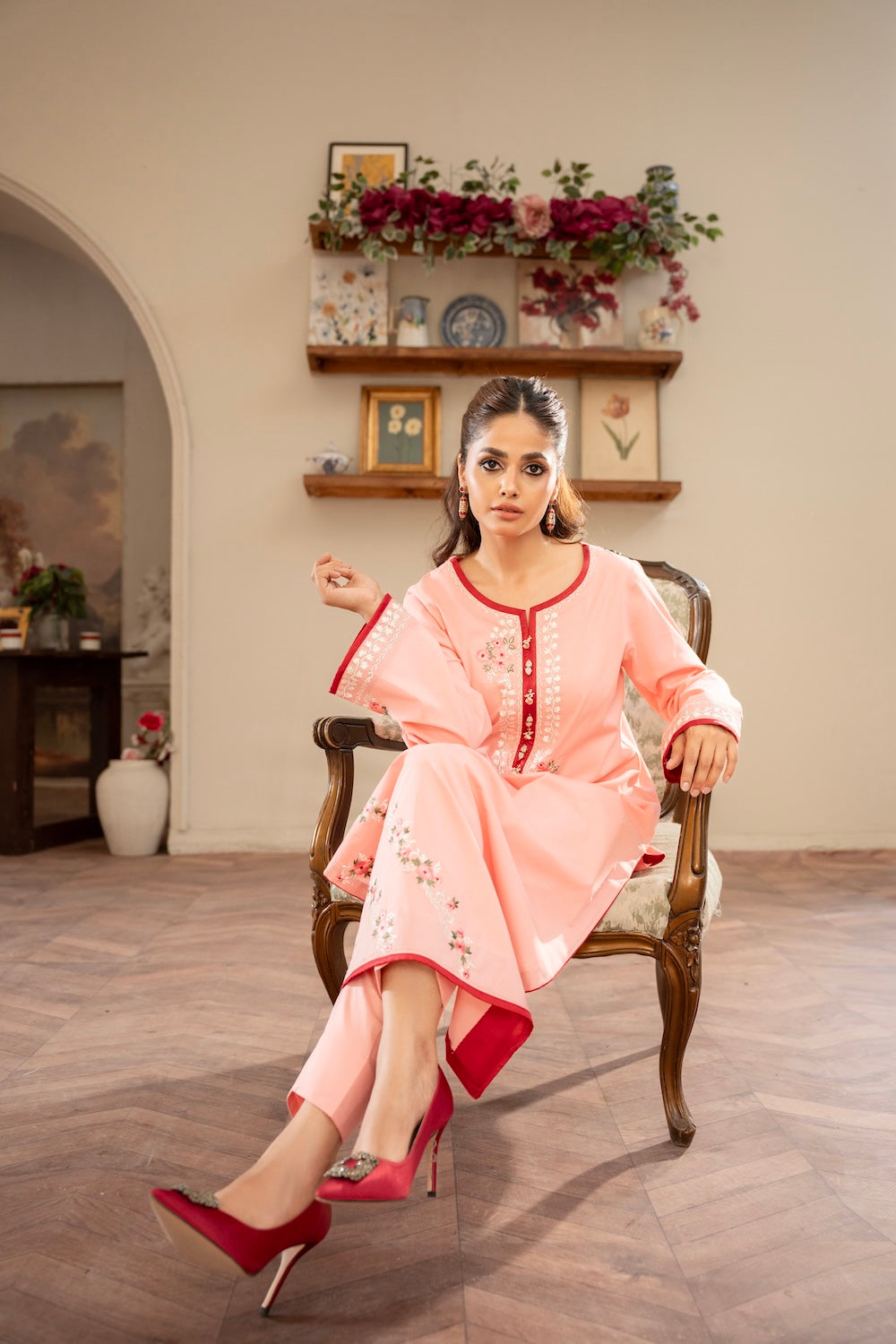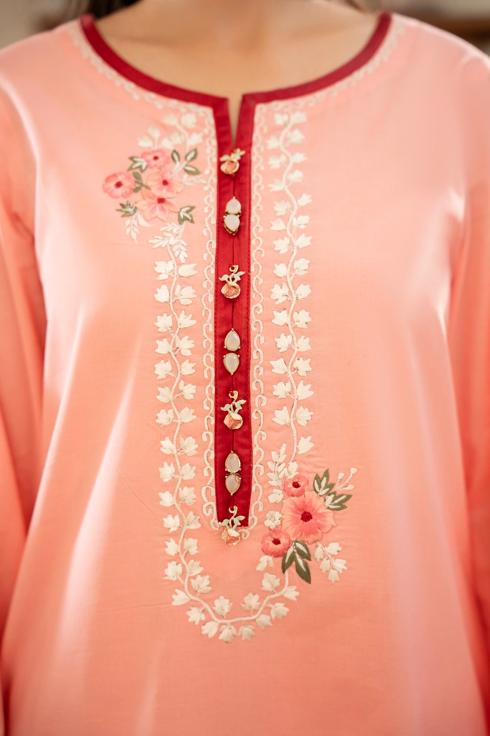 This charming 2-piece stitched outfit in a soft peach hue is beautifully adorned with traditional hand-machine embroidery in delicate shades of pink, creating a graceful and feminine ensemble. The straight-cut kameez features intricate floral and leafy patterns in blush, rose, and deep pink threads, thoughtfully placed along the neckline, sleeves, and hem for an elegant finish. Crafted from a lightweight, breathable fabric, the outfit is paired with matching straight trousers. Ideal for festive daytime events or semi-formal gatherings, this ensemble blends warm peach tones with romantic pink embroidery for a refined, timeless look.