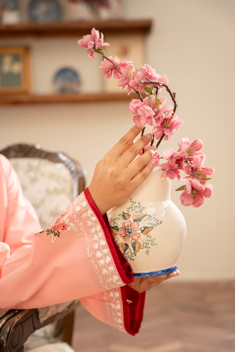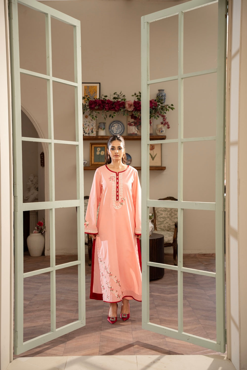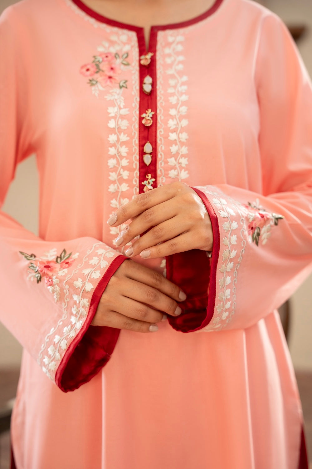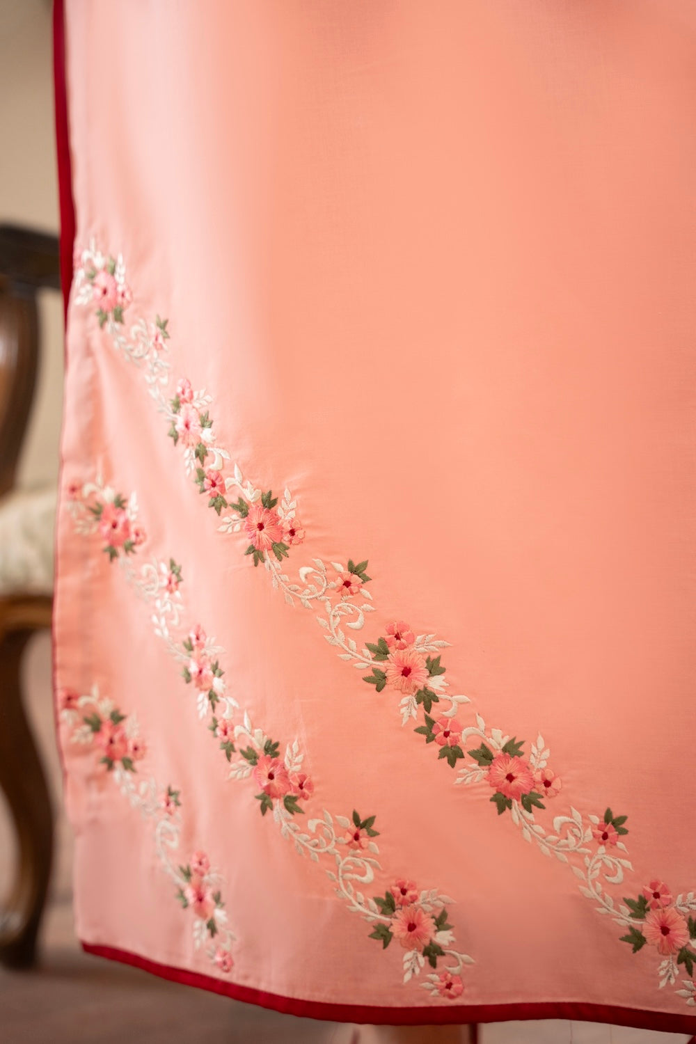 This charming 2-piece stitched outfit in a soft peach hue is beautifully adorned with traditional hand-machine embroidery in delicate shades of pink, creating a graceful and feminine ensemble. The straight-cut kameez features intricate floral and leafy patterns in blush, rose, and deep pink threads, thoughtfully placed along the neckline, sleeves, and hem for an elegant finish. Crafted from a lightweight, breathable fabric, the outfit is paired with matching straight trousers. Ideal for festive daytime events or semi-formal gatherings, this ensemble blends warm peach tones with romantic pink embroidery for a refined, timeless look.